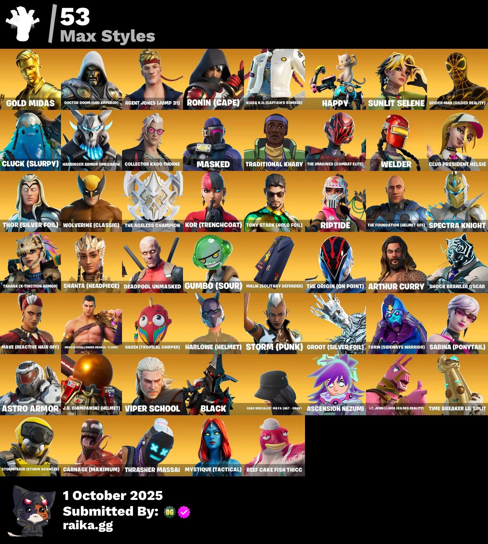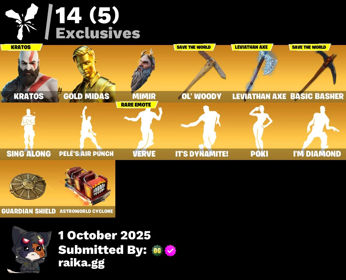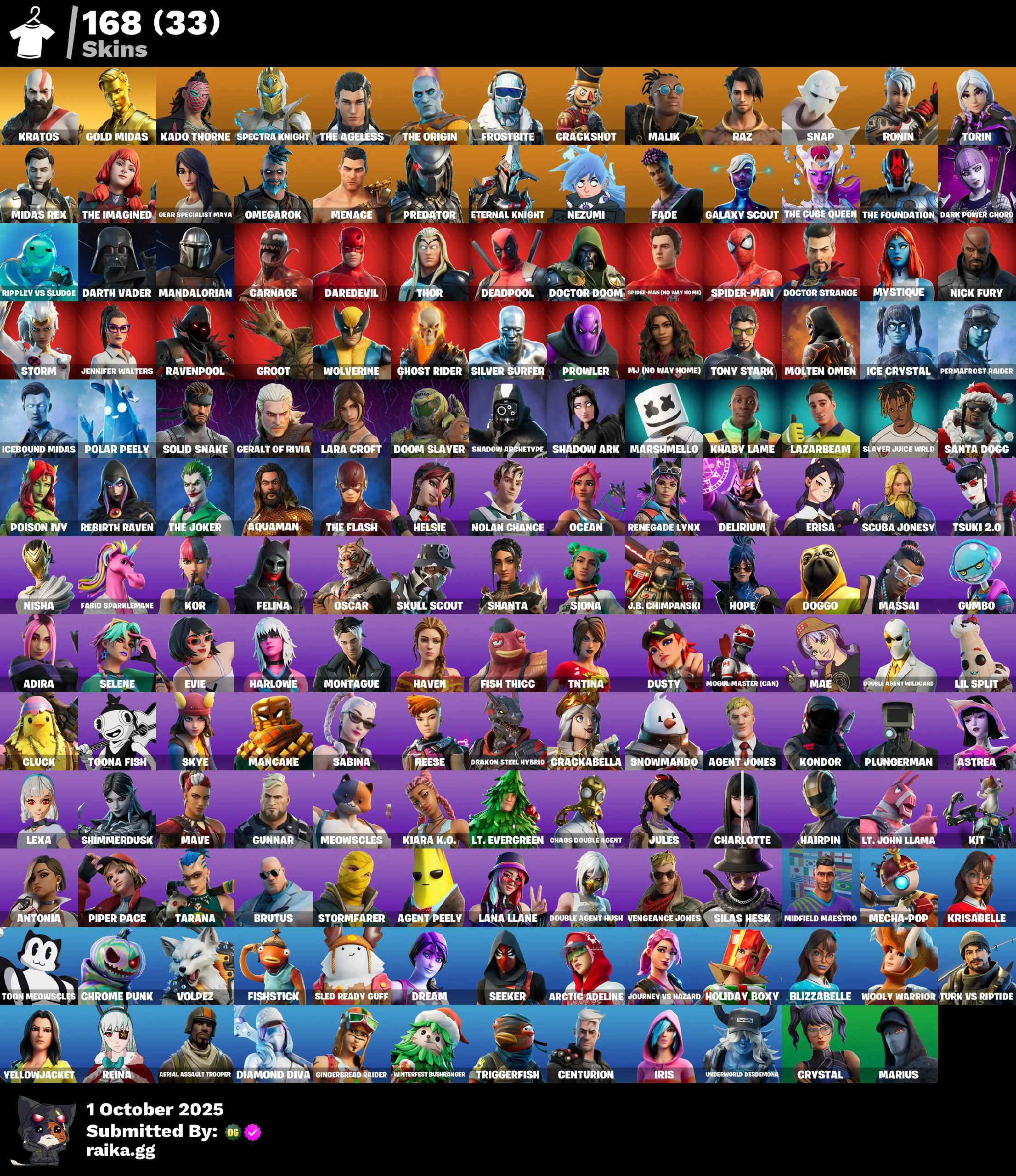 PC/PSN/Xbox/Nintendo 168 skins | Leviathan Axe | Aerial Assault Trooper | Kratos | Gold Midas | Kado Thorne | Spectra Knight | The Ageless | The Origin | Frostbite | Crackshot | 550 VB