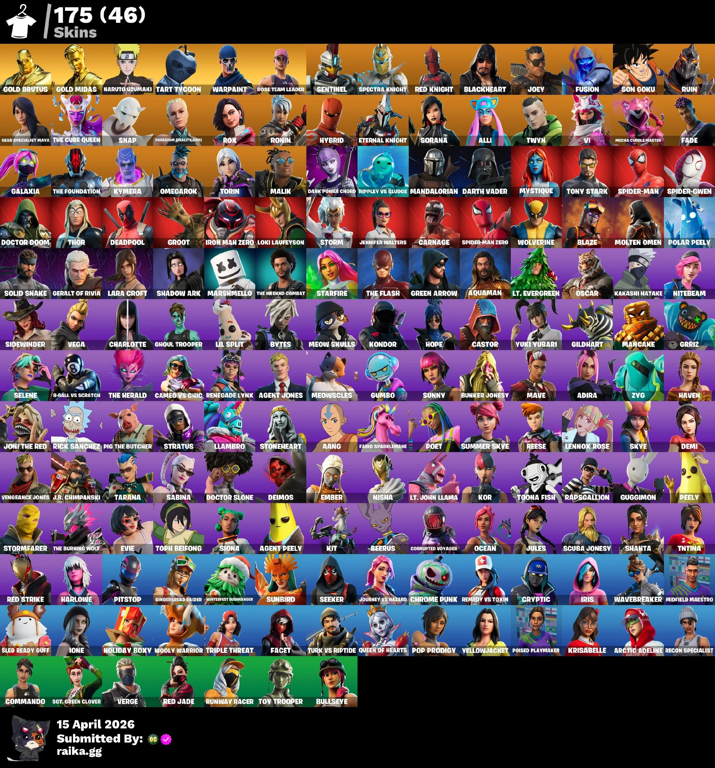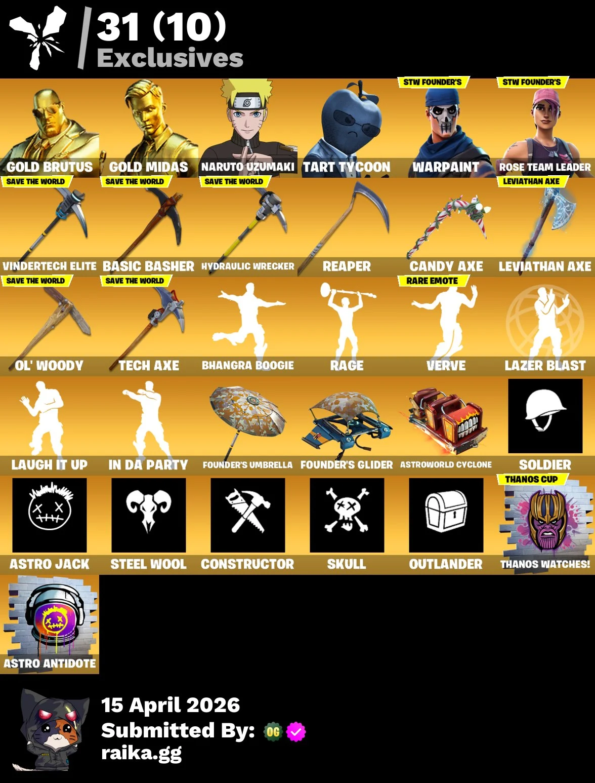 PC/PSN/Xbox/Nintendo 175 skins | OG STW Leviathan Axe | Lara Croft | Vi | Naruto Uzumaki | Gold Brutus | Gold Midas | Tart Tycoon | Sentinel | Spectra Knight | Red Knight | Blackheart | Joey | Fusion | 200 VB