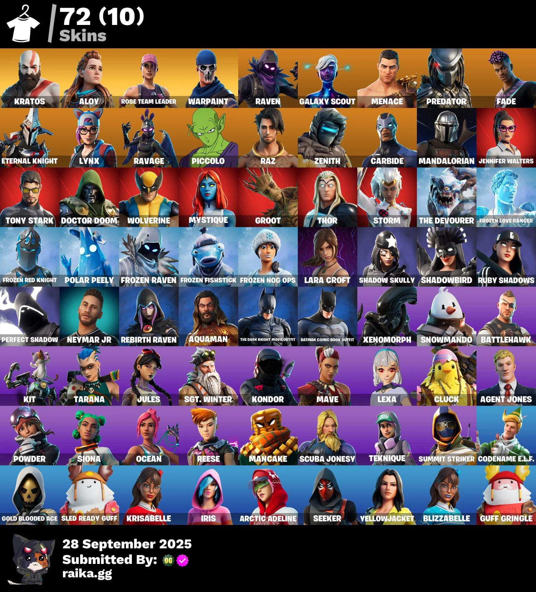 PC/PSN/Xbox/Nintendo 72 skins | OG STW | Leviathan Axe | Kratos | Aloy | Raven | Galaxy Scout | Menace | Predator | Fade | Eternal Knight | Lynx | Ravage | Piccolo | Raz | Zenith | 470 VB