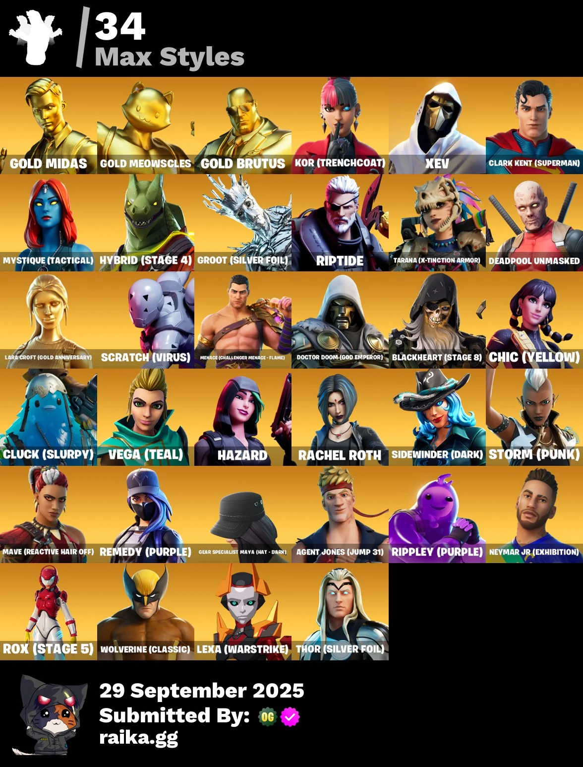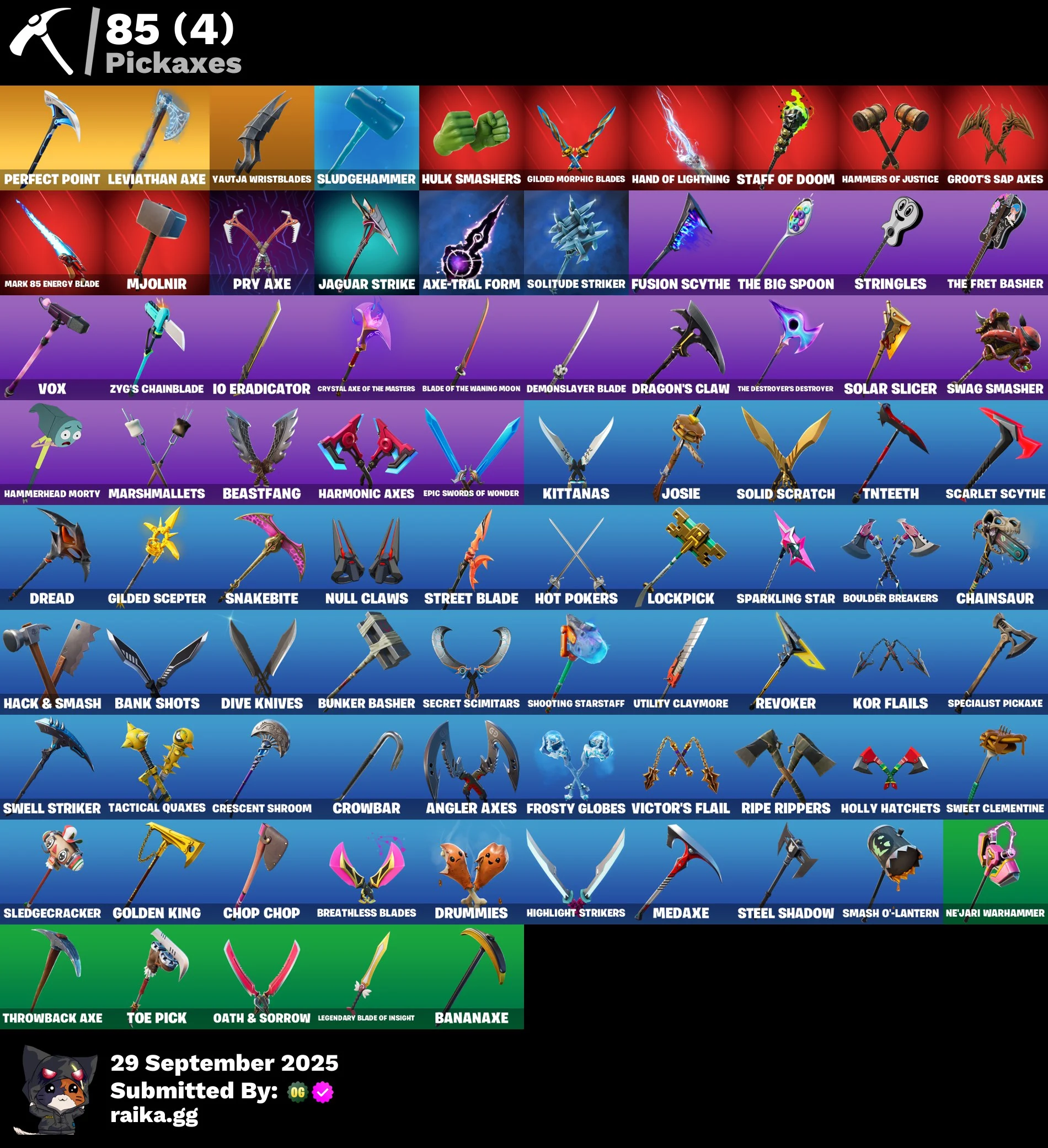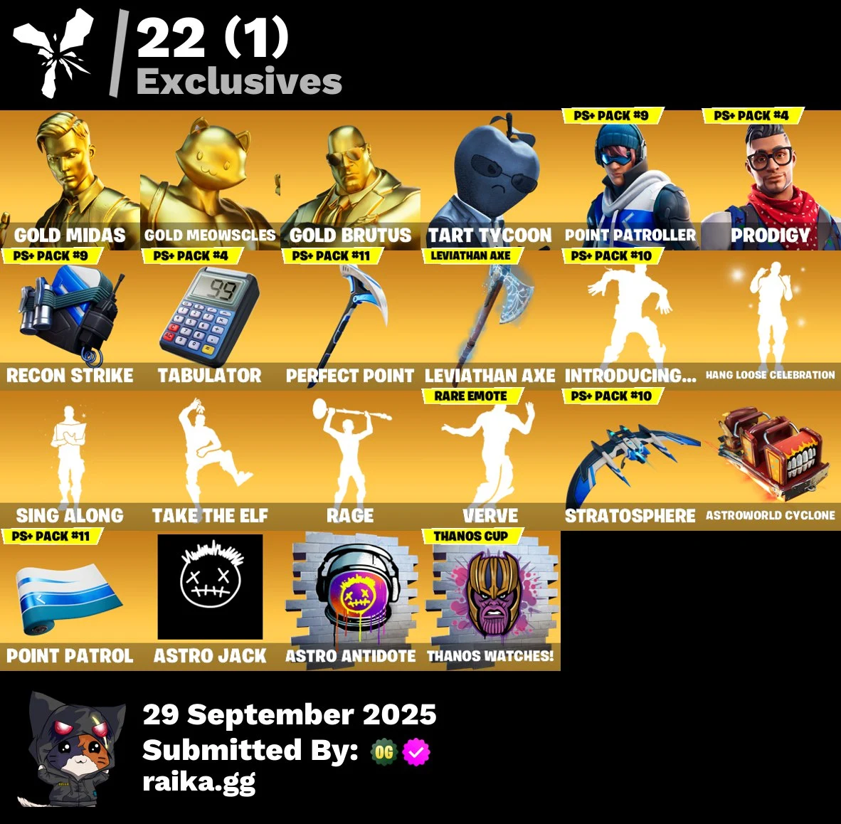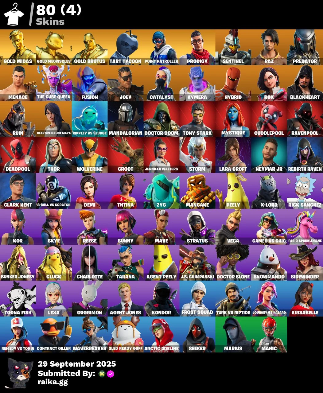 PC/PSN/Xbox/Nintendo 80 skins | Leviathan Axe | Gold Midas | Gold Meowscles | Gold Brutus | Tart Tycoon | Point Patroller | Prodigy | Sentinel | Raz | Predator | Menace | 350 VB