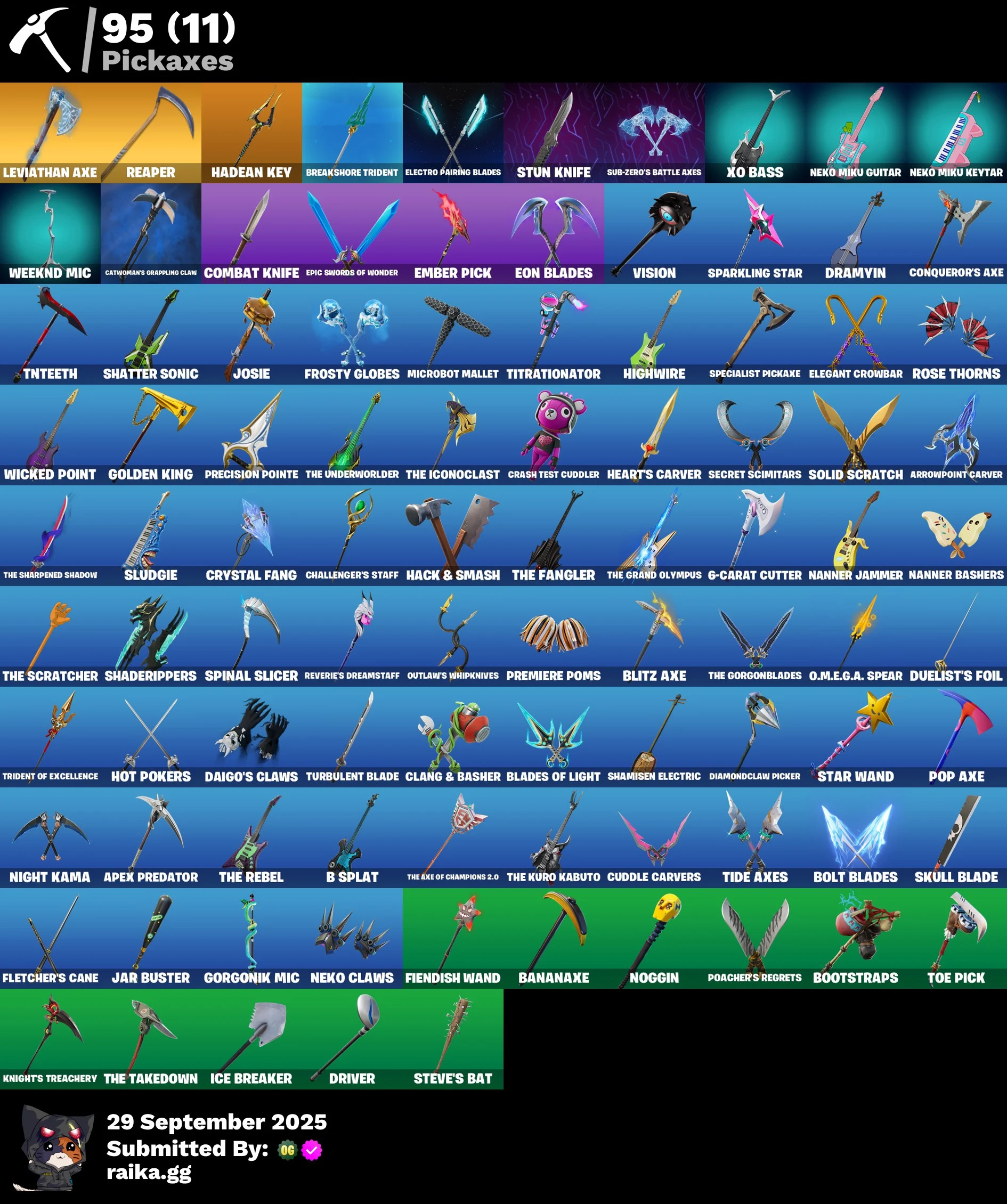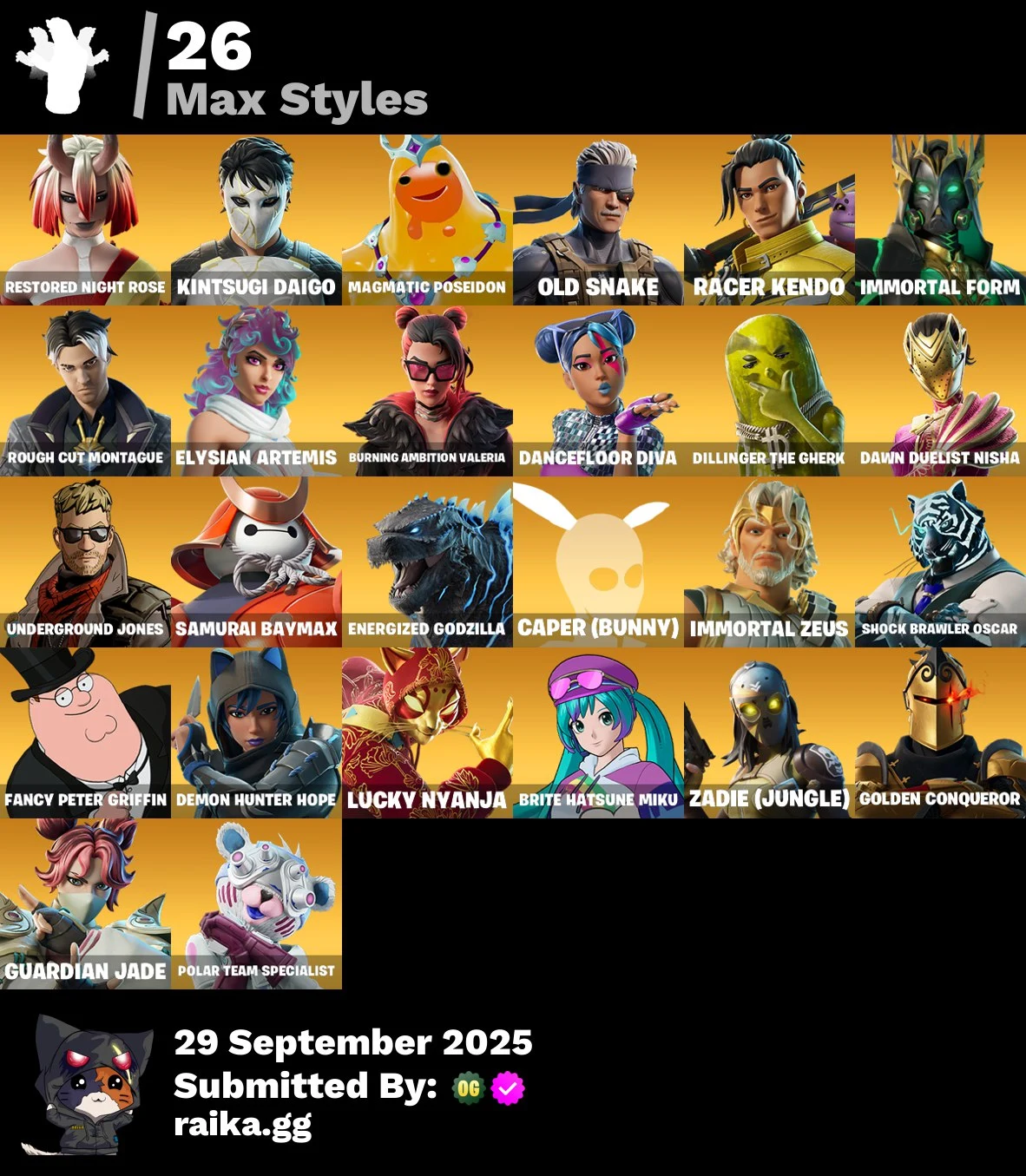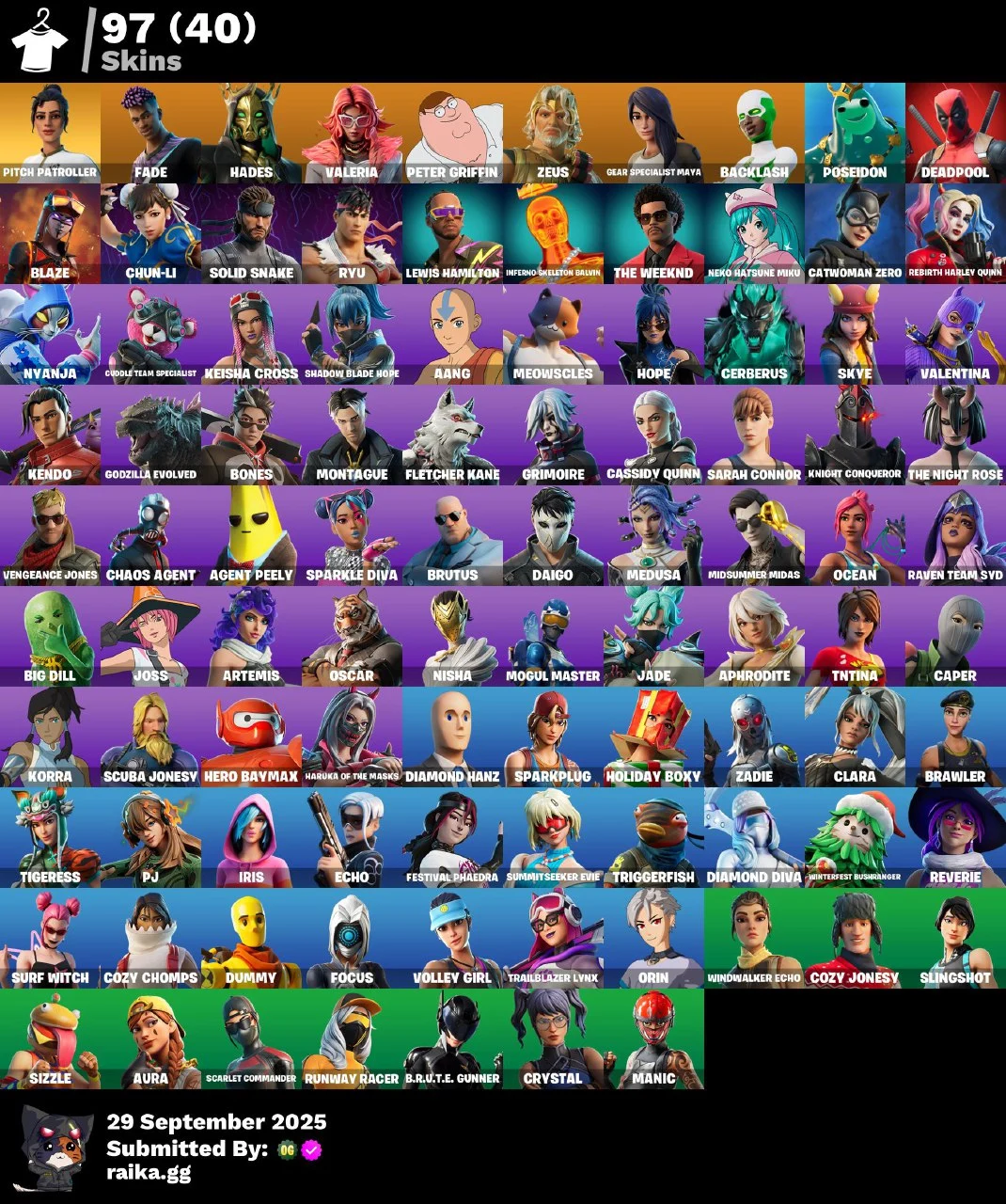 PC/PSN/Xbox/Nintendo 97 skins | Leviathan Axe | Pitch Patroller | Fade | Hades | Valeria | Peter Griffin | Zeus | Gear Specialist Maya | Backlash | Poseidon | Deadpool | Blaze | 450 VB