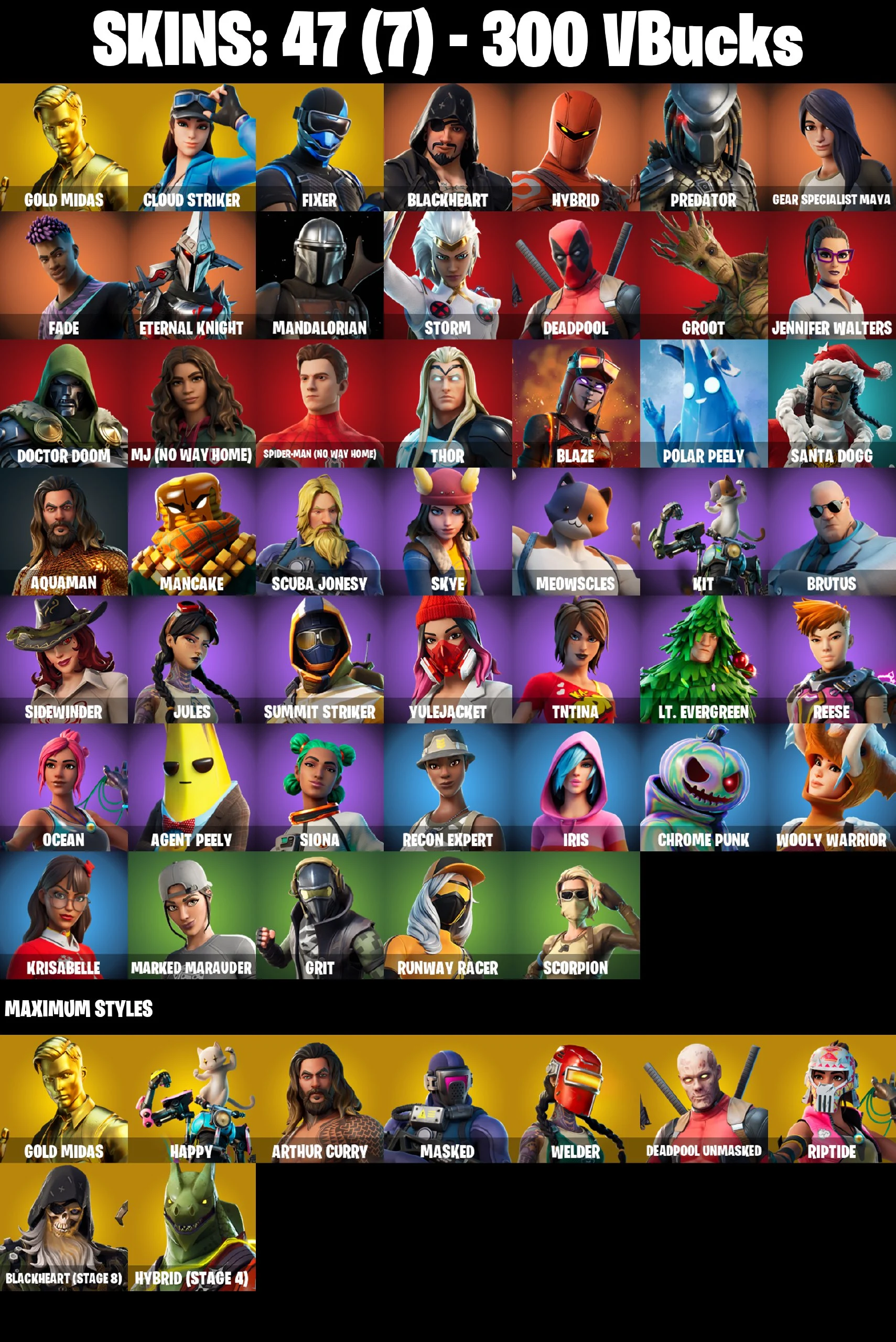 ⭐ [PC/PSN/XBOX/NINTENDO/MOBILE] 47 SKINS | GOLD MIDAS | CLOUD STRIKER | FIXER | MANDALORIAN | ETERNAL KNIGHT | DEADPOOL | GROOT | MJ NO WAY HOME | SPIDER-MAN NO WAY HOME | THOR | BLAZE | AQUAMAN | SKYE | MEOWSCLES | BRUTUS | 300 VBUCKS | EMAIL