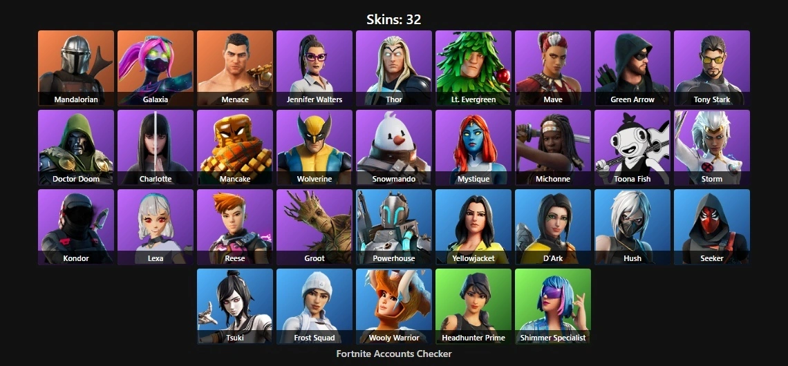 PC/XBOX/PSN 32 Skins⚡ | Mandalorian | Galaxia | Menace | Jennifer Walters | Thor | Lt. Evergreen | Mave | Green Arrow | Tony Stark | Doctor Doom | Charlotte