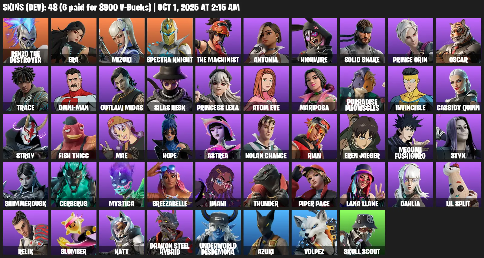 PC/XBOX/PSN 48 Skins⚡ | Renzo the Destroyer | Era | Mizuki | Spectra Knight | The Machinist | Antonia | Highwire | Solid Snake | Prince Orin | Oscar | Trace