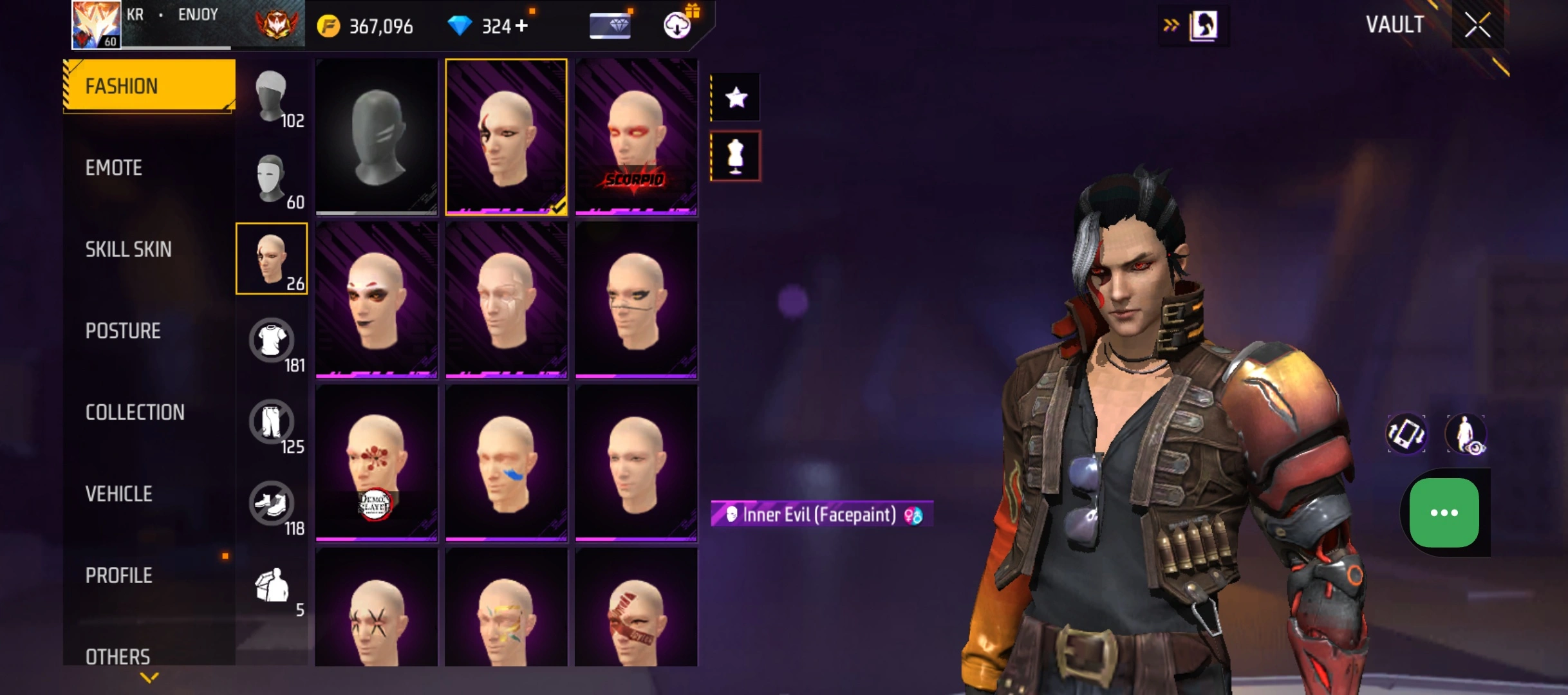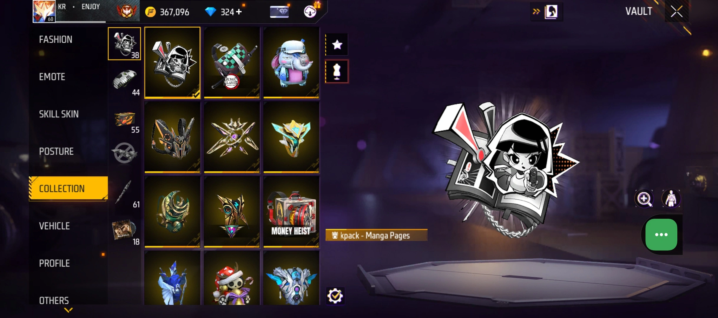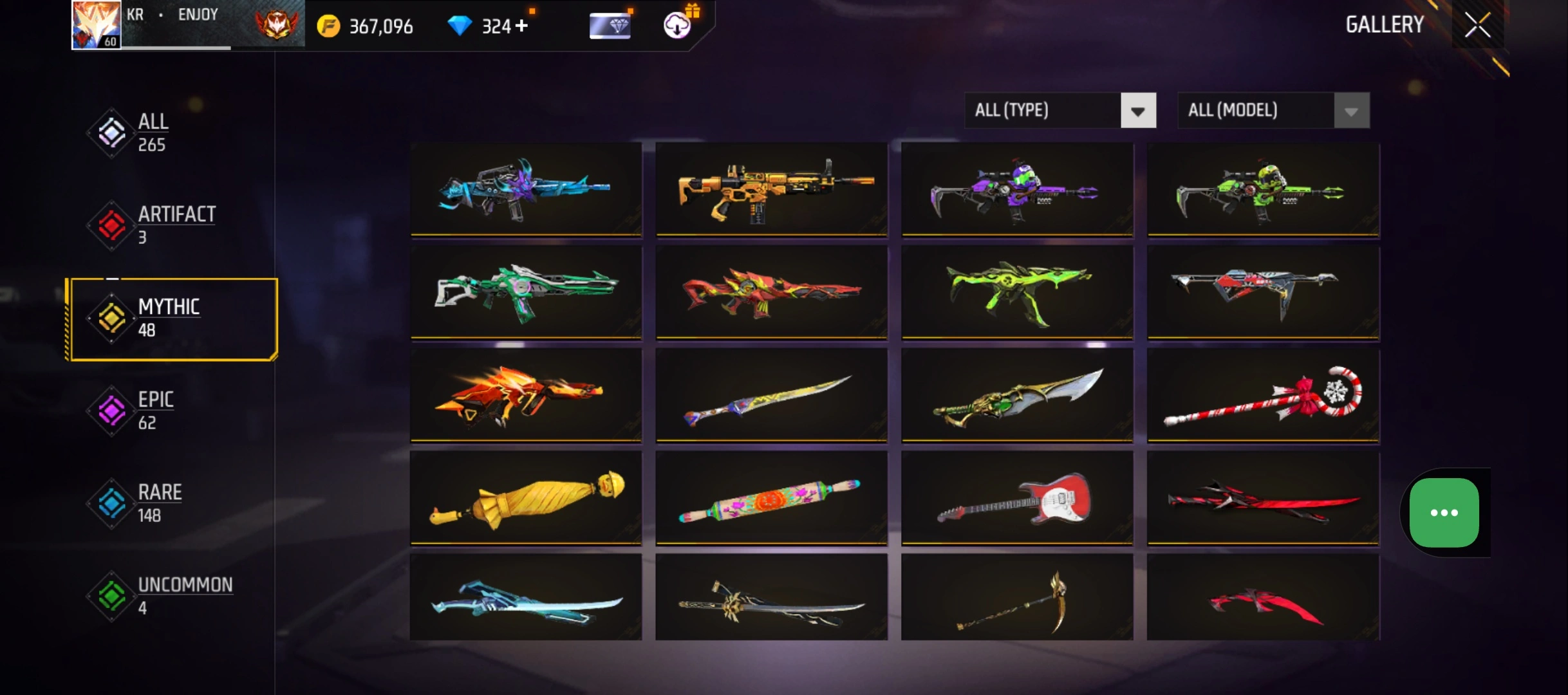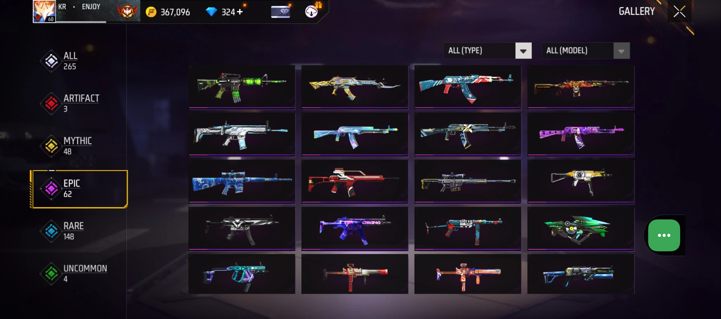 B50|LV60/265 WEAPON (3 EVO + 48 Mythic)/MP40 ⸱ Predatory Cobra Lv. 5/M1887 ⸱ Sterling Conqueror Lv. 5/M1014 ⸱ Scorpio Shatter Lv. 1/181 COSTUME (6 Mythic)/33 EMOT (12 Mythic)/38 BACKPACK (14 Mythic)/7 SPORTS CAR