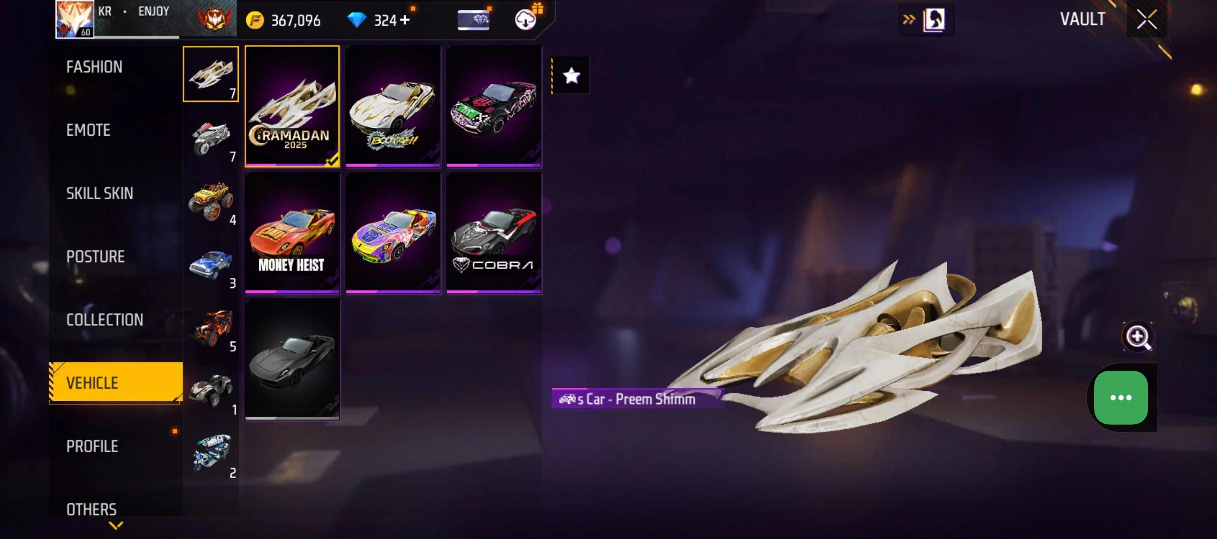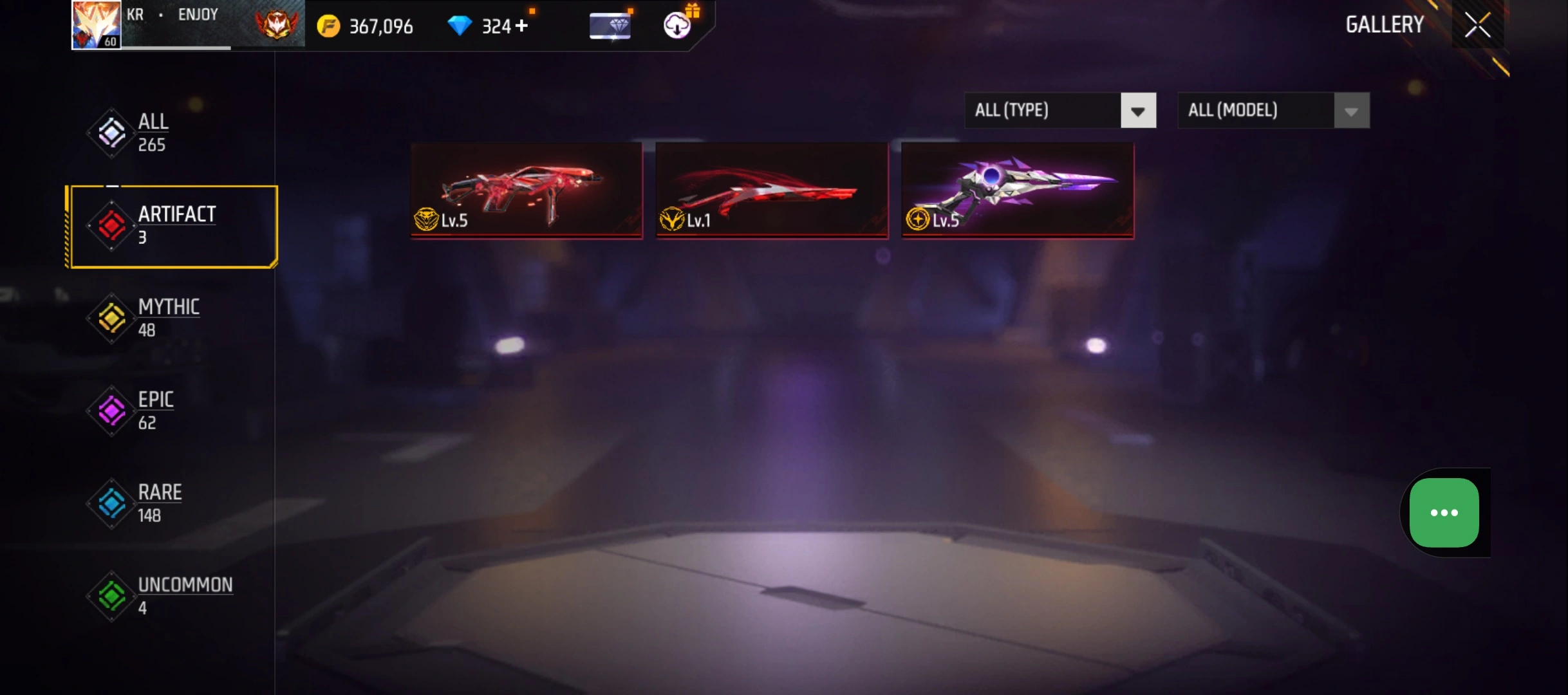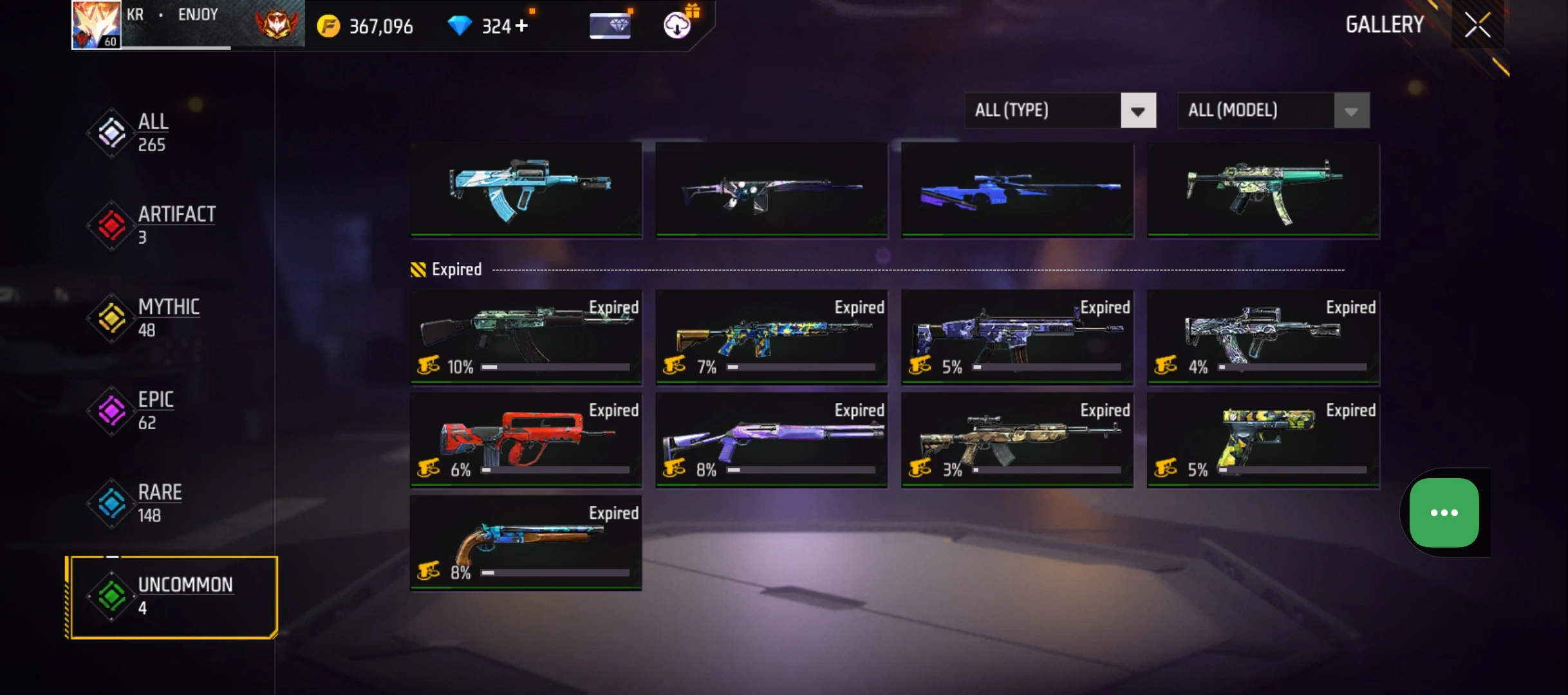 B50|LV60/265 WEAPON (3 EVO + 48 Mythic)/MP40 ⸱ Predatory Cobra Lv. 5/M1887 ⸱ Sterling Conqueror Lv. 5/M1014 ⸱ Scorpio Shatter Lv. 1/181 COSTUME (6 Mythic)/33 EMOT (12 Mythic)/38 BACKPACK (14 Mythic)/7 SPORTS CAR
