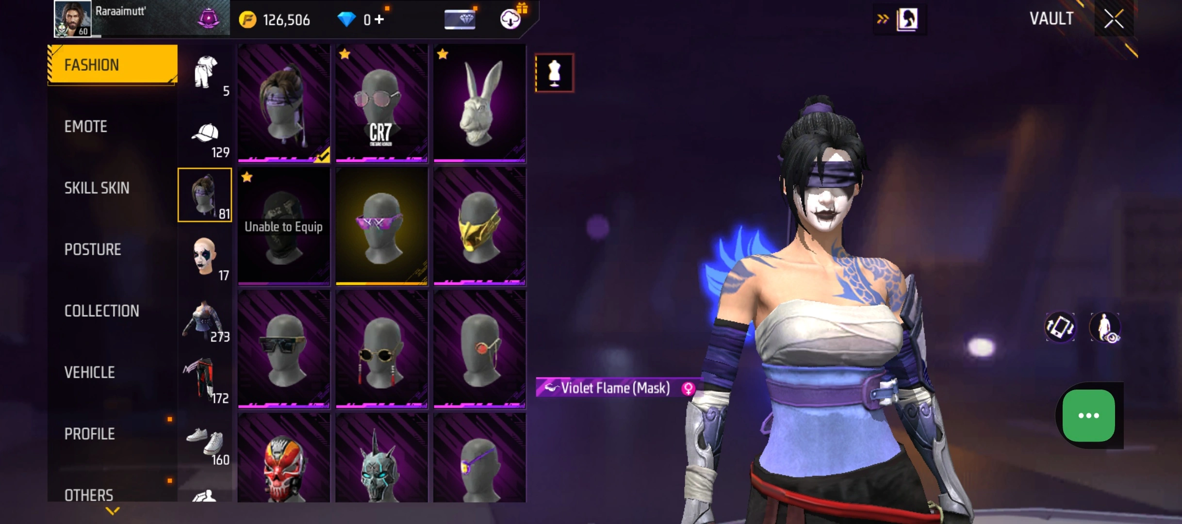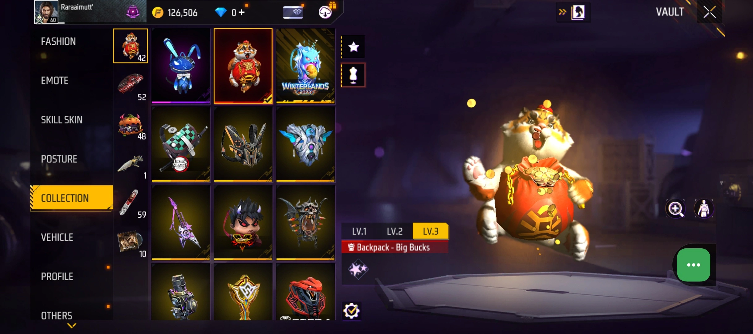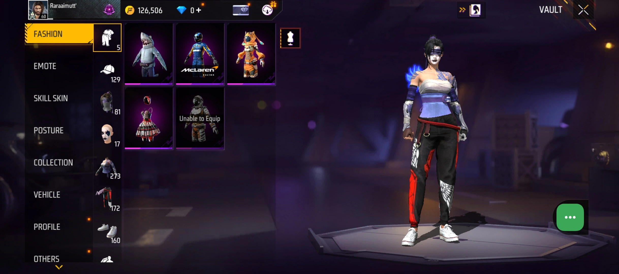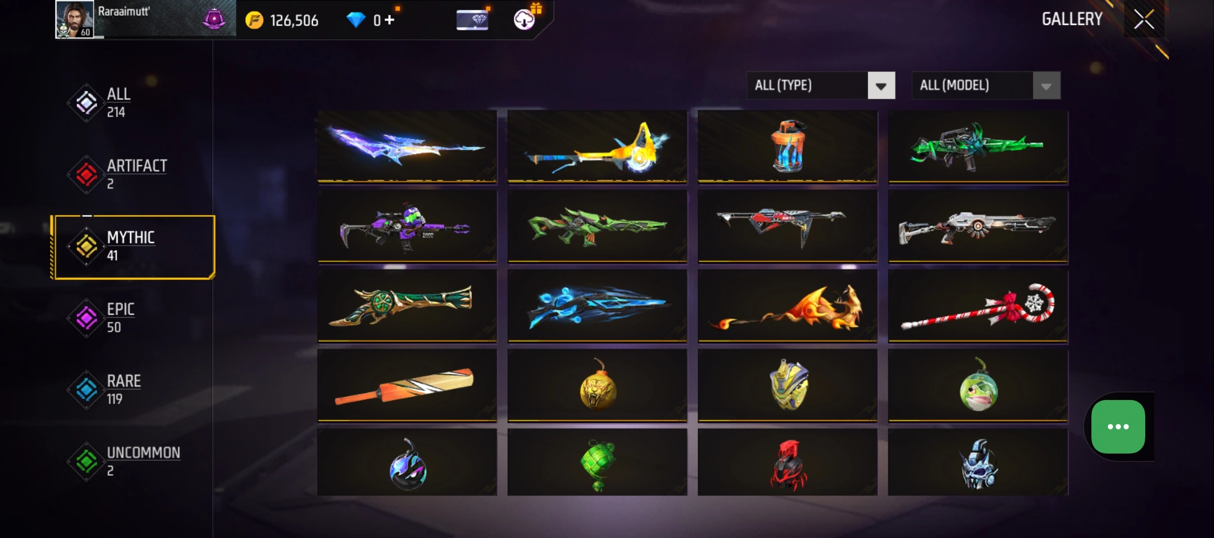 B60|LV60/214 WEAPON (2 EVO + 41 Mythic)/AK47 ⸱ Blue Flame Draco Lv. 3/SCAR ⸱ Megalodon Alpha Lv. 3/273 COSTUME (12 Mythic)/25 EMOT (7 Mythic)/42 BACKPACK (1 Artifact + 10 Mythic)/5 SPORTS CAR