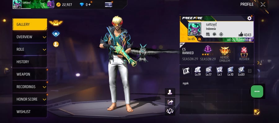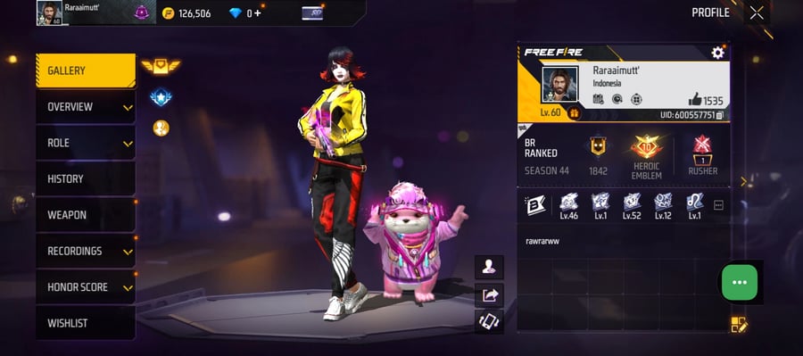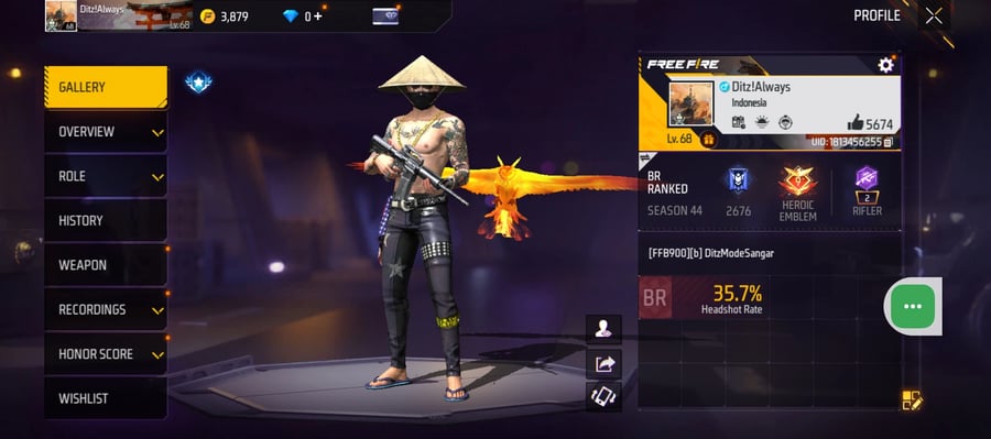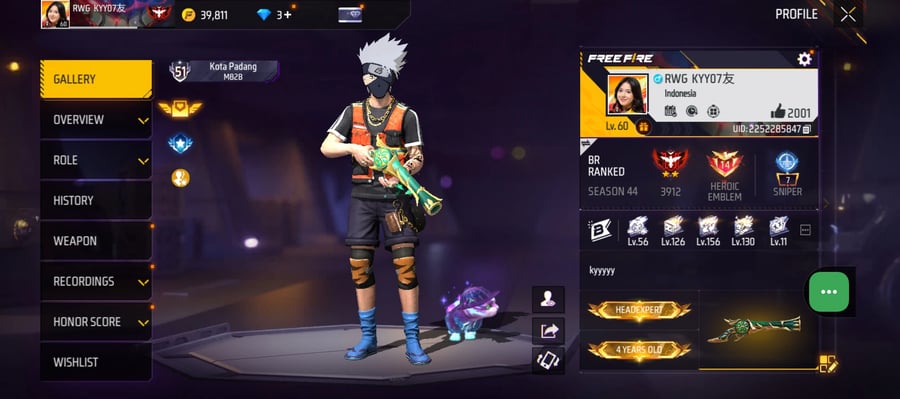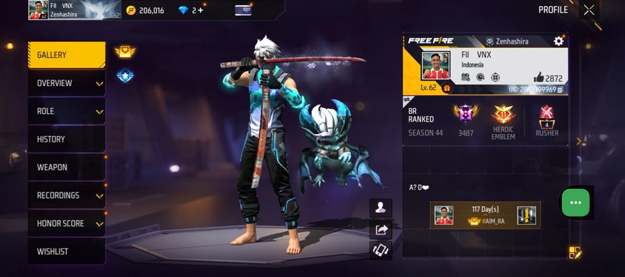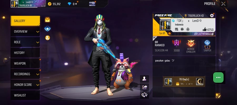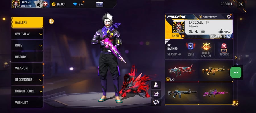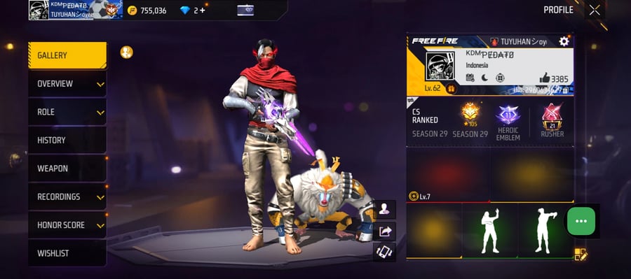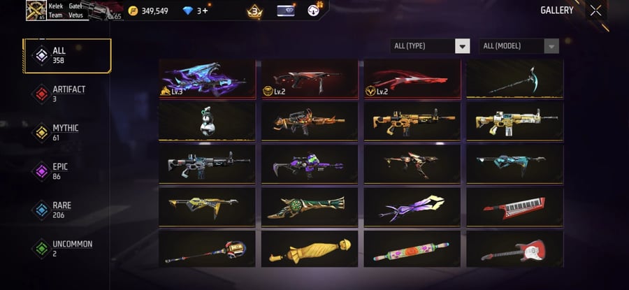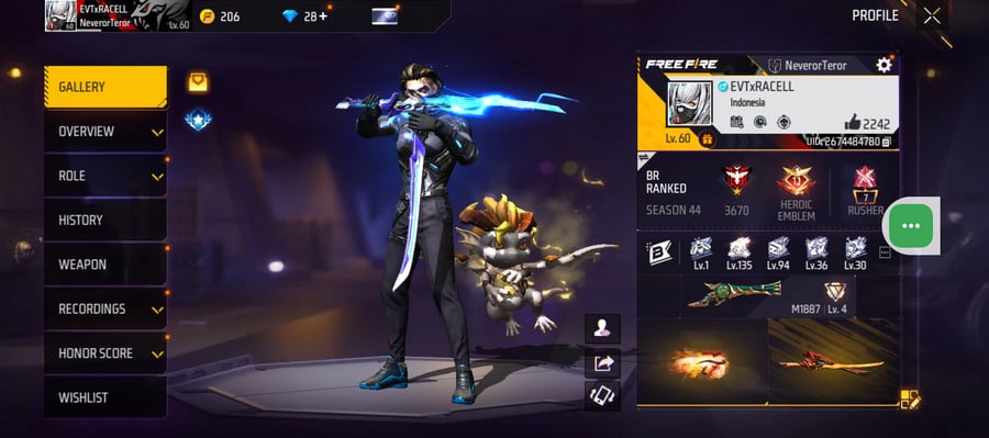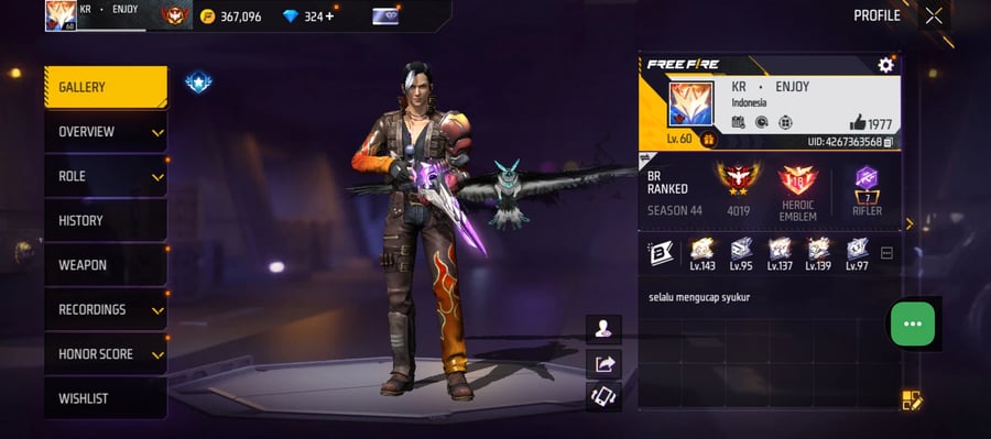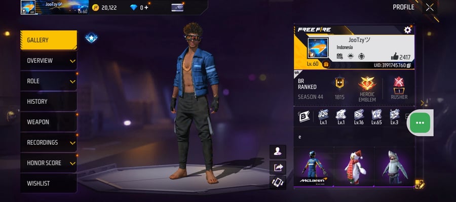 FF120|LV61/337 WEAPON (1 EVO + 33 Mythic)/M1014 ⸱ Scorpio Shatter Lv. 6/335 COSTUME (1 Artifact + 19 Mythic)/43 EMOT (1 Artifact + 17 Mythic)/58 BACKPACK (2 Artifact + 23 Mythic)/12 SPORTS CAR (3 Mythic)