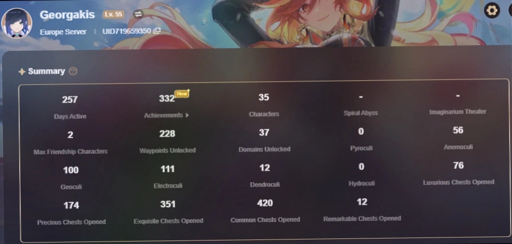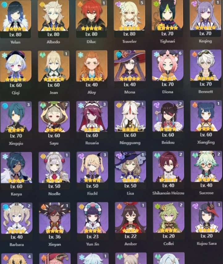 [EU HANDLEVELED] AR 55+Heroes: 34 (Diluc C1+ Albedo C0+ Yelan C0+ Tighnari C0+ Keqing C0)+Leg heroes/weapons: 8/1 #ITEM-160672