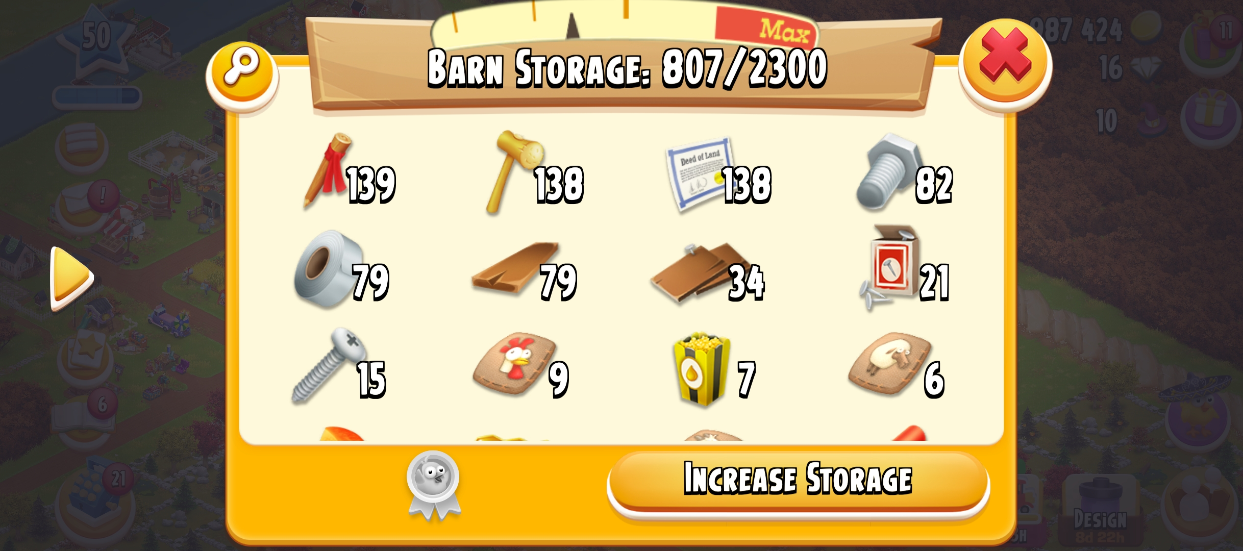 50 level | Barn Storage 2300 | Silo Storage 1000 | 980k Coin | 15 Gems | Android & IOS