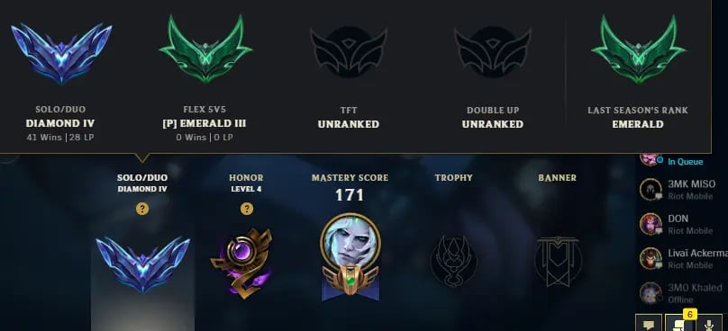 Les joueurs Diamond font également face à des restrictions de file plus strictes. En file Solo/Duo, les joueurs de ce palier ne peuvent faire la queue qu’avec d’autres situés dans un intervalle de deux divisions de leur rank ; ainsi, un joueur Diamond II peut s’associer uniquement avec quelqu’un d’au moins Diamond IV. En file Flex, les règles sont un peu plus souples, sans aucune restriction pour les joueurs Diamond et en dessous. La perte de LP entre aussi en vigueur à ce palier, avec une déperdition de 50 LP par jour après 28 jours d’inactivité, ce qui empêche un maintien passif du rank.