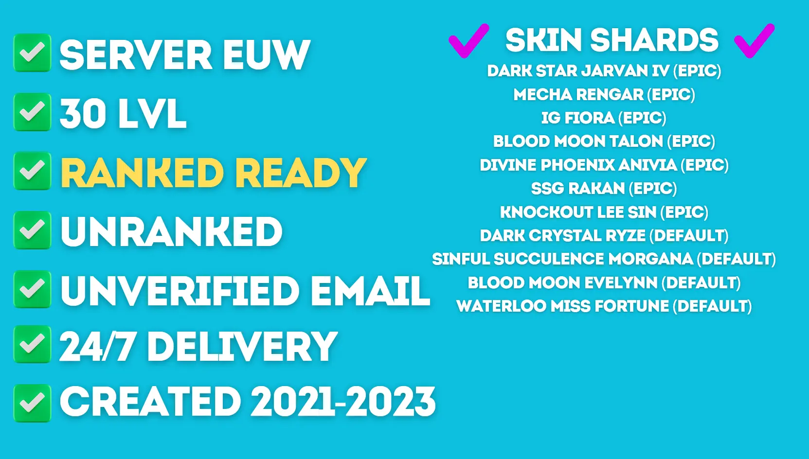 EUW 30 LvL ✅ Ranked Ready ✅ BE: 57705 ✅ Unverified ✅ Unranked ✅ Shards: Dark Star Jarvan IV, Mecha Rengar, iG Fiora, Blood Moon Talon, Divine Phoenix Anivia, SSG Rakan, Knockout Lee Sin, Dark Crystal Ryze, Sinful Succulence Morgana, Blood Moon Evelynn