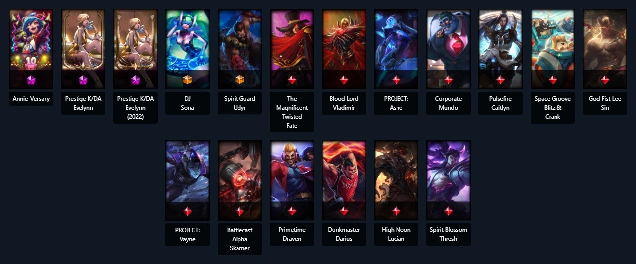 UnRanked┃110 skins┃164 Champs┃(3 Mythic) Prestige K/DA Evelynn Dunkmaster Darius Battlecast Alpha Skarner Primetime Draven God Fist Lee Sin Spirit Blossom Thresh PROJECT: Vayne