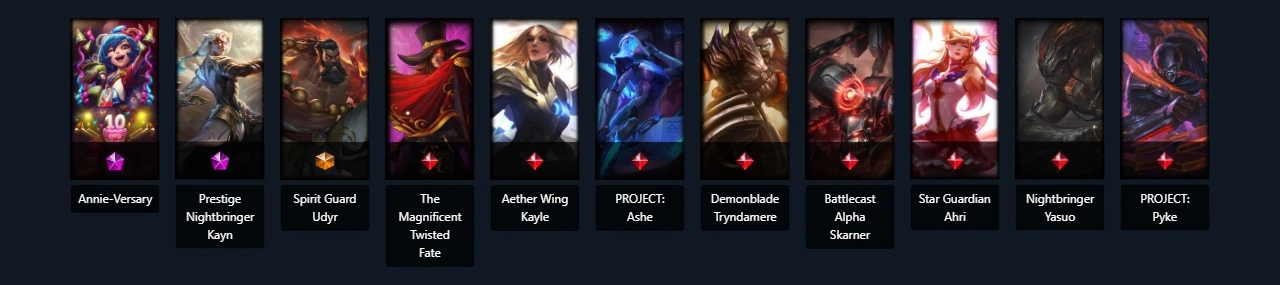 UnRanked┃167 skins┃170 Champs┃(2 Mythic) Prestige Nightbringer Kayn Nightbringer Yasuo PROJECT: Ashe The Magnificent Twisted Fate Aether Wing Kayle Demonblade Tryndamere PROJECT: Pyke