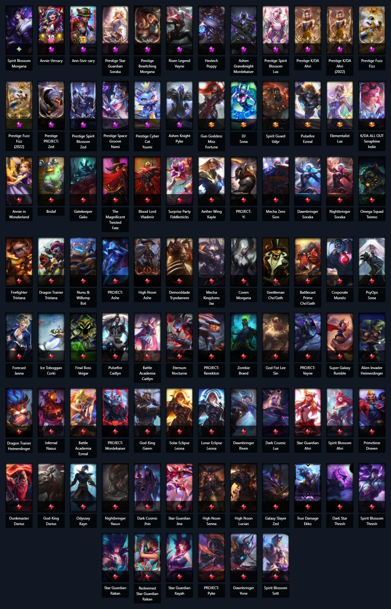 UnRanked┃877 skins┃171 Champs┃(17 Mythic) Risen Legend Vayne Ashen Graveknight Mordekaiser Ashen Knight Pyke Prestige Spirit Blossom Zed Prestige Space Groove Nami Hextech Poppy Prestige K/DA Ahri