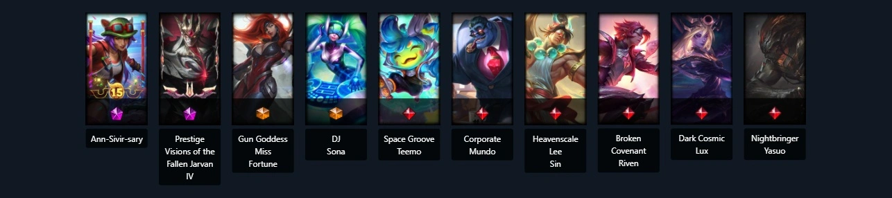 UnRanked┃93 skins┃165 Champs┃(2 Mythic) Prestige Visions of the Fallen Jarvan IV Space Groove Teemo Dark Cosmic Lux Broken Covenant Riven Nightbringer Yasuo Corporate Mundo Heavenscale Lee Sin