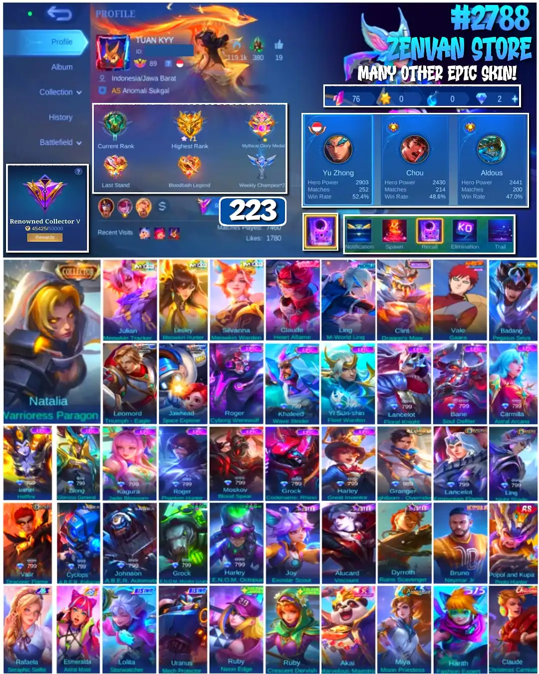 #2788 🔥 223 Skins 🔥 Collector Natalia 🔥 Gara 🔥 M-World Ling 🔥 Seint Seiya Badang 🔥 Many Epic 🔥 Safe Account ✅