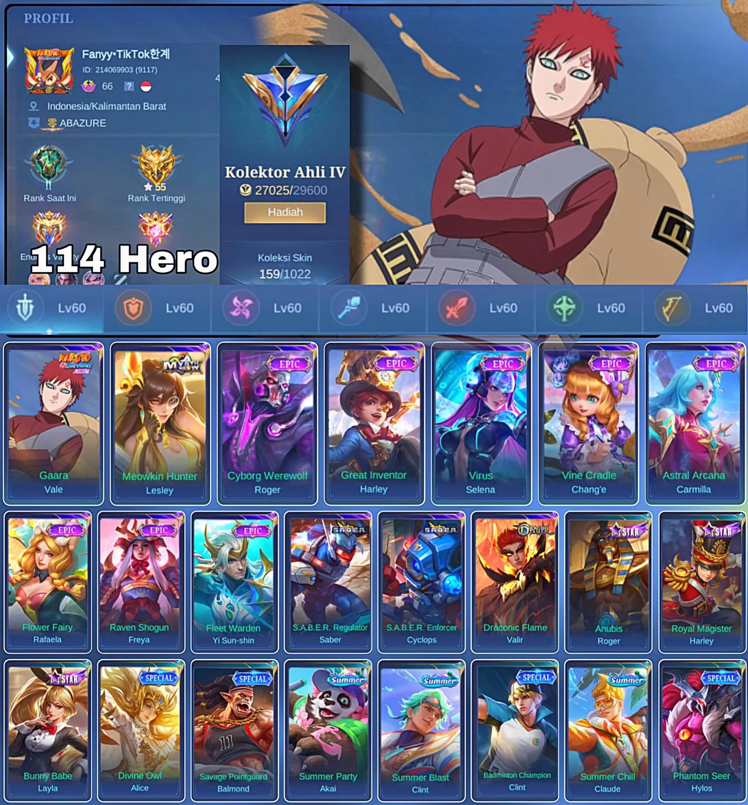 HERO 114 SKIN 159 | EMBLEM ALL MAX | VALE GARA | EPIC ROGER | STUN SELENA | EPIC YSS | HERO GOOD | SKIN GOOD | INSTAN DELIVERY