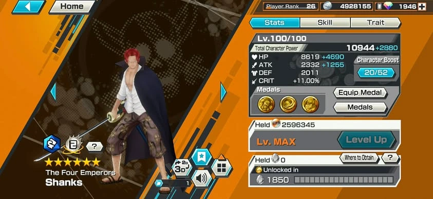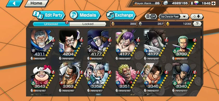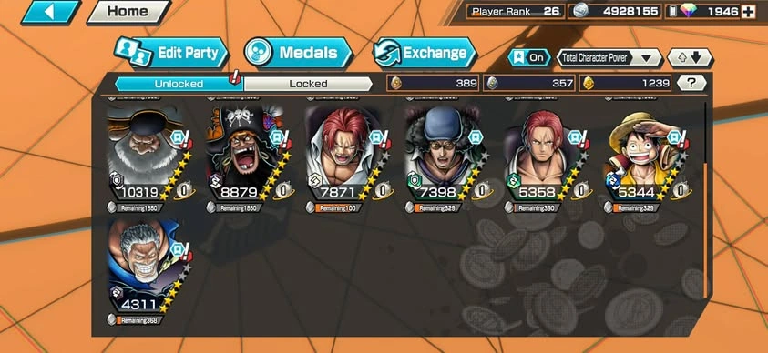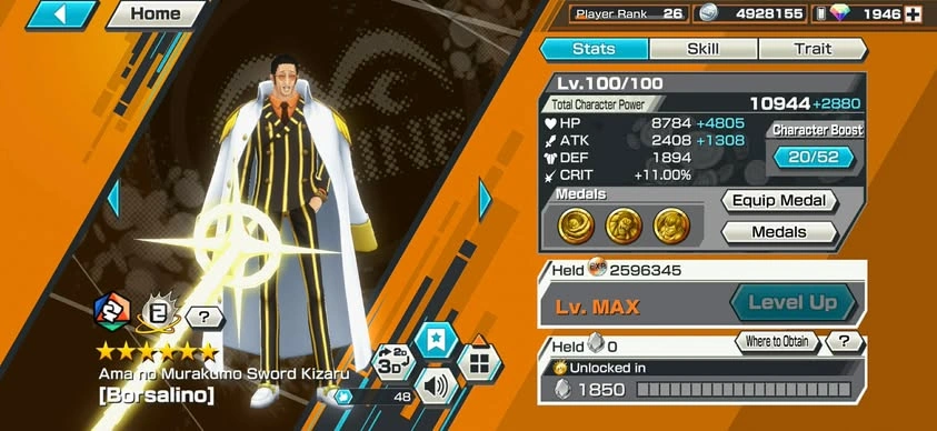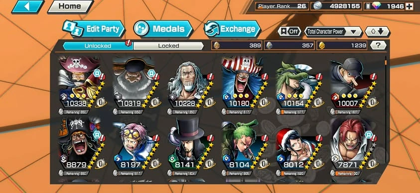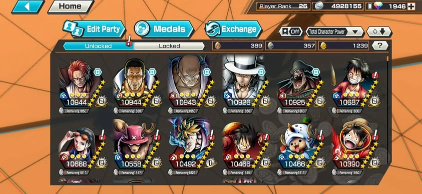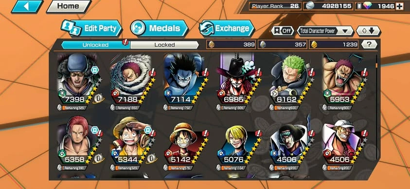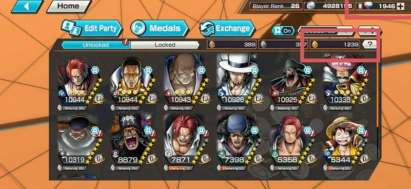 [NTT3079][ANDROID] 13 EX META / Can 9 Max / Kizaru + Blackbeard + Garp + Nusjuro + Shanks + Lucci + Saturn + Kuzan + Roger , 1946 gems Android , 1239 fragments , Support 146% , Good Medal