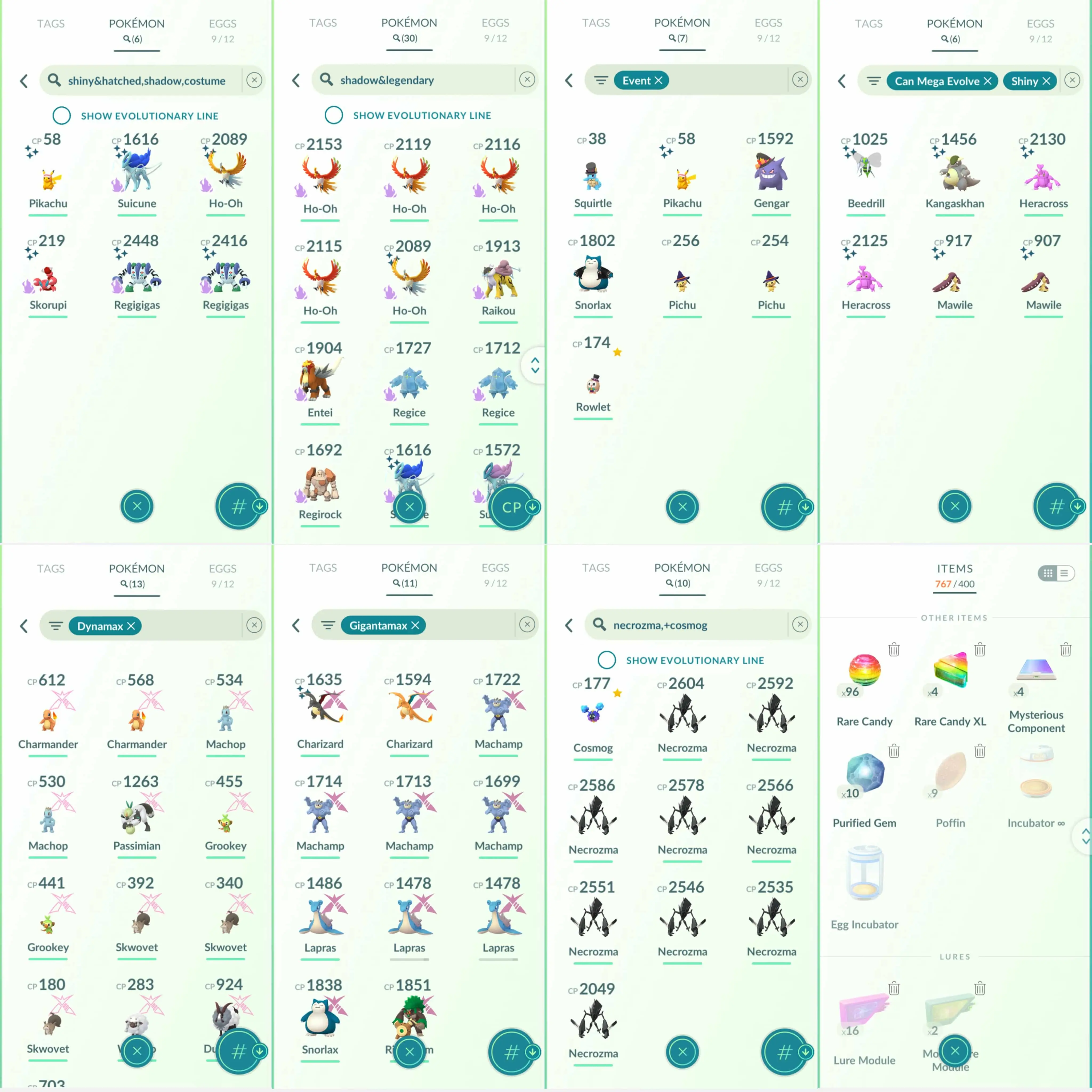 Shiny: Celebi, shadow suicune, shadow ho-oh, dialga, Dialga Origin(from a trade), palkia, shadow regigigas, giratina, cobalion, terrakion, kyurem