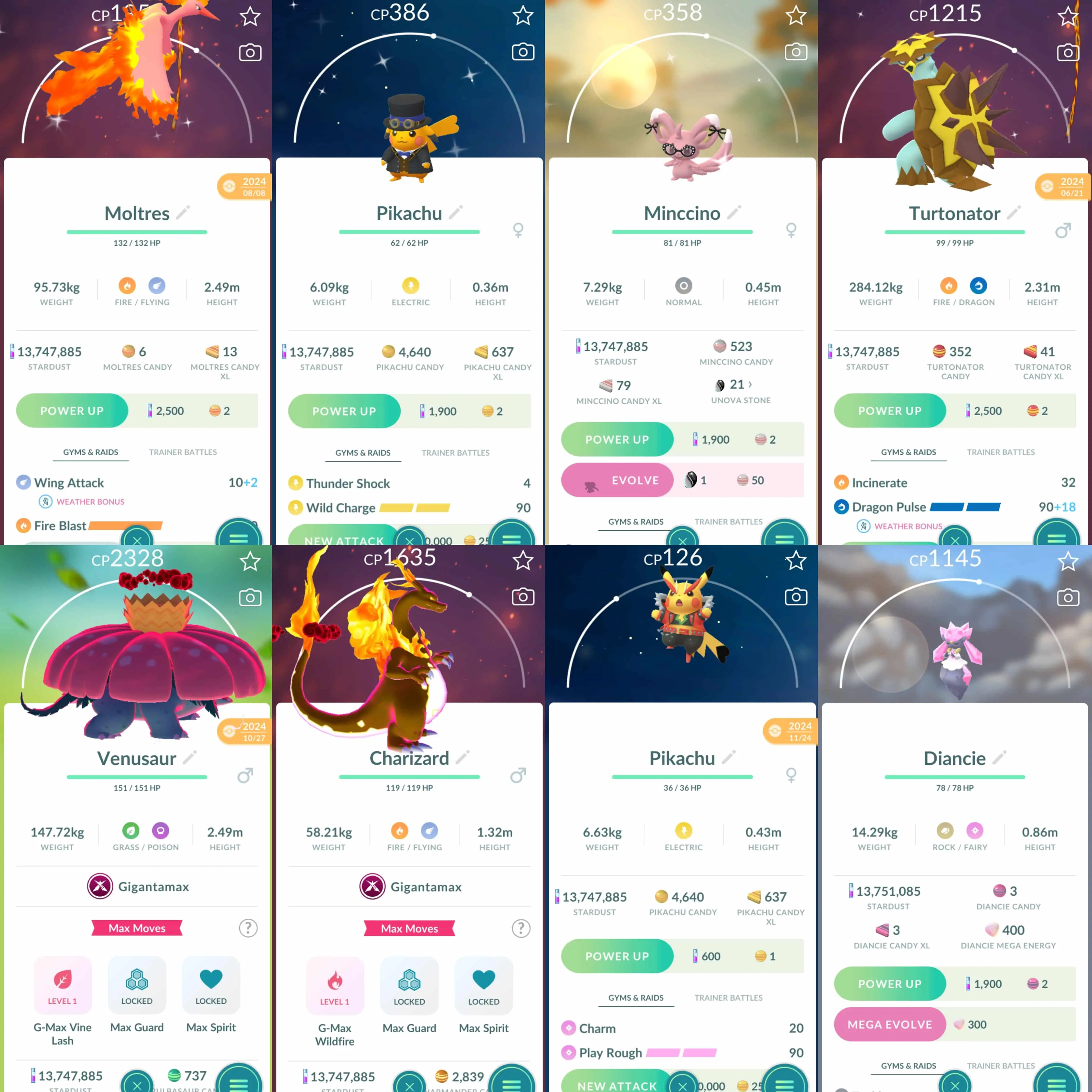 Shiny: Dapper Pikachu blue, costumed minccino, turtonator