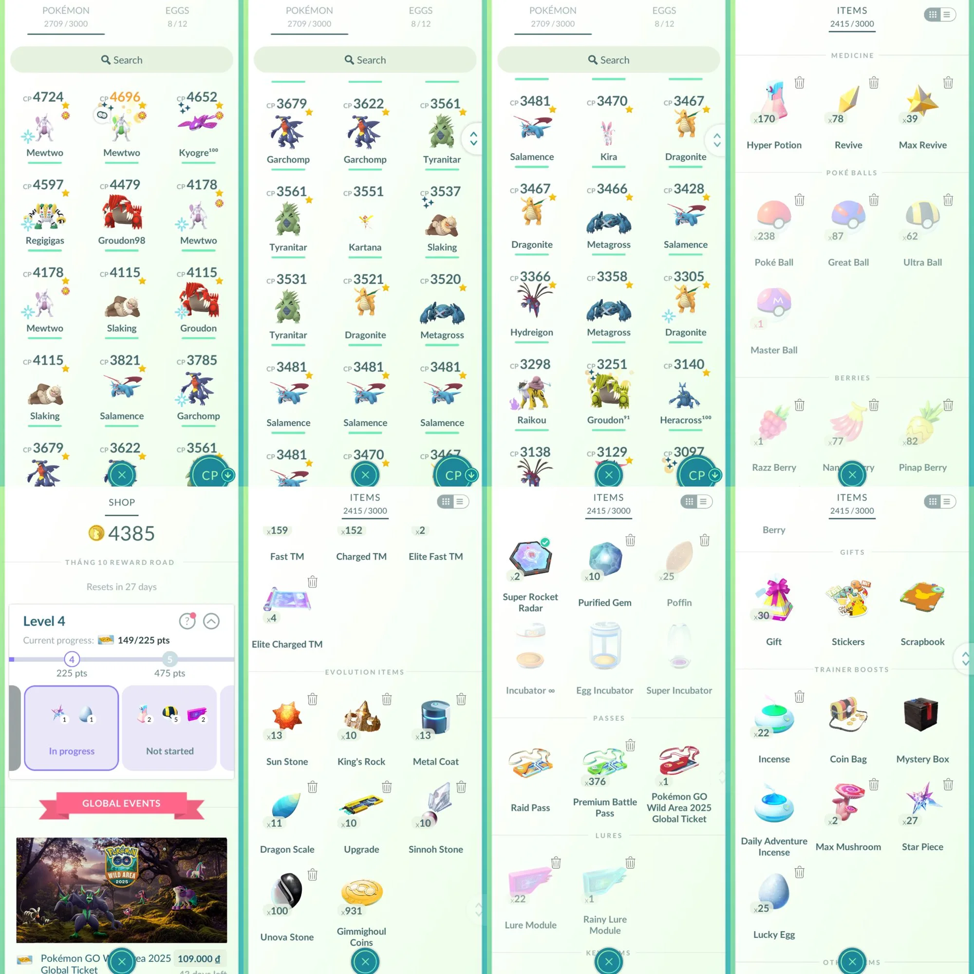 Level 50-25 legend iv100-376 pass-4385 Coins-3 Shundo Legend Mewtwo+Kyogre+Tapu fini-285m+ Stardust-865 legend-919 shiny-579 Hundo-513m+ XP-95 costume