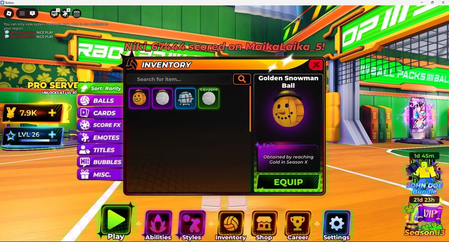 Le jeu propose un système de progression basé sur les styles et les capacités. Les styles déterminent les statistiques de votre personnage dans différentes compétences du volleyball telles que la hauteur de saut, la puissance du smash, l’efficacité du bloc et la force du service. Ils sont déclinés en cinq niveaux de rareté : Commun, Rare, Légendaire, Divin et Secret, les raretés supérieures offrant une meilleure performance globale. Les capacités fonctionnent comme des compétences actives que vous pouvez déclencher pendant les matchs pour obtenir des avantages tactiques. Styles et capacités s’obtiennent via un système de rotation où les joueurs dépensent la monnaie du jeu (Yen) ou des rotations chanceuses pour des récompenses aléatoires. Les codes offrent des rotations supplémentaires pour débloquer de meilleures options. À propos des comptes Volleyball Legends