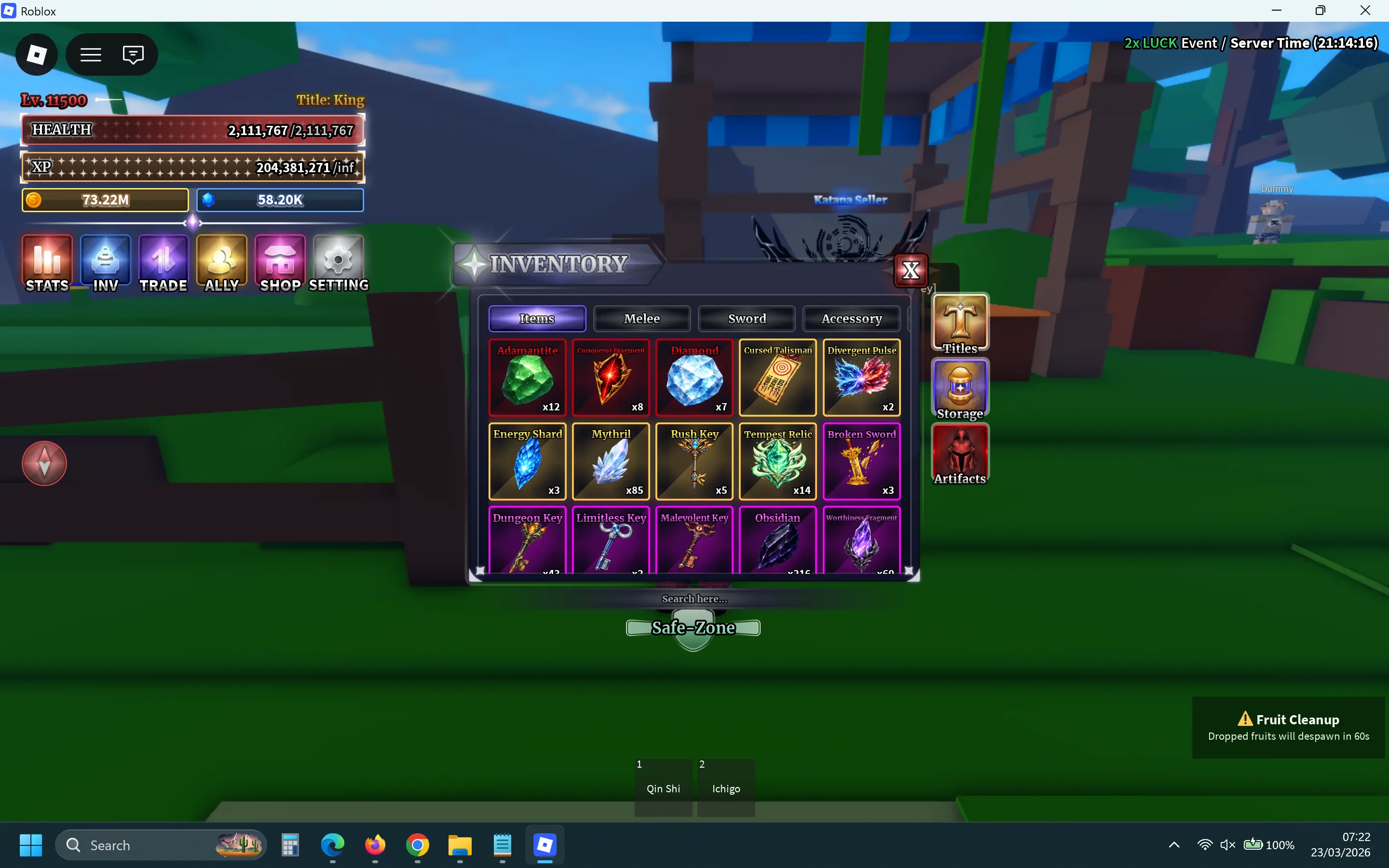 [Instant] [Sailor Piece] Level 11500 | Race Galevorn | Trait Cataclysm | Clan Zoldyk | 73M Money | 58K Gems | Qin Shi | Ichigo | Title: King | Bounty 90000+