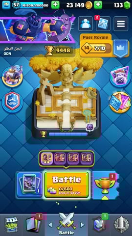 CR Lvl 57 almost 58 ✨ 9400 Trophy ✨ KT 15 ✨ 14 Elite cards ✨ 59 max cards ✨ 17 Evo cards ✨ 8 year badge ✨ 66 emotes ✨ 8 Tower skins