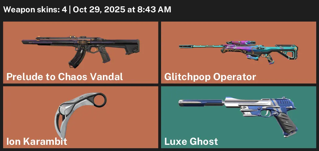 🍖 AP 🦙 Unranked 🐻 4 Skins 🛠 8 VP 🥡 8 Agents 🍦 Value: 9575 VP 😚 Prelude to Chaos Vandal 🌂 Glitchpop Operator 🛤 Ion Karambit 📽 Luxe Ghost