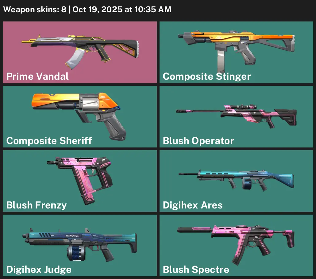 🍍 BR 🔋 Unranked 🐾 8 Skins 🫁 25 VP 🧱 4 Agents 🌮 Value: 1775 VP 😢 Prime Vandal 🧵 Composite Stinger 🪝 Composite Sheriff 🐚 Blush Operator 🌱 Blush Frenzy 😰 Digihex Ares