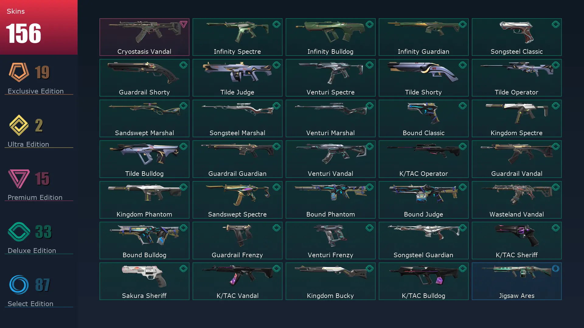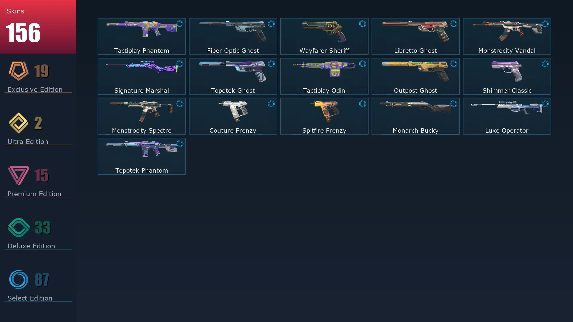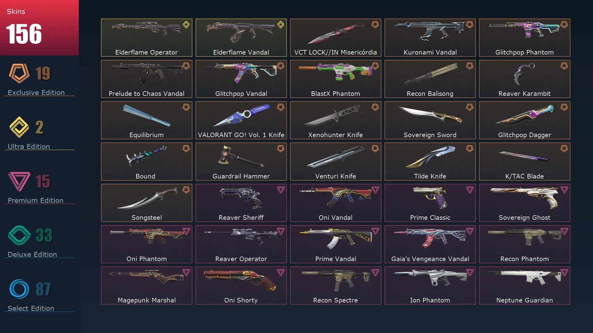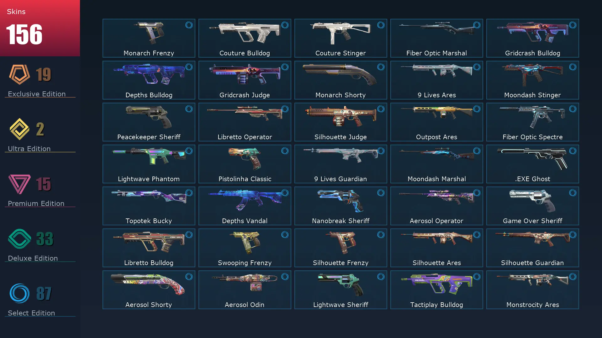 EU ⛩ 156 Skins 🫐 29 Agents 🥑 253 Level 🤚 VCT LOCK//IN Misericórdia 🚕 Oni Phantom 📯 Equilibrium 🏋️ Infinity Spectre 🪼 Sovereign Sword 🖲 Ion Phantom 🦶 Jigsaw Guardian 🧤 Recon Spectre 🌍 Recon Phantom 🪬 BlastX Phantom 😕 Prime Classic