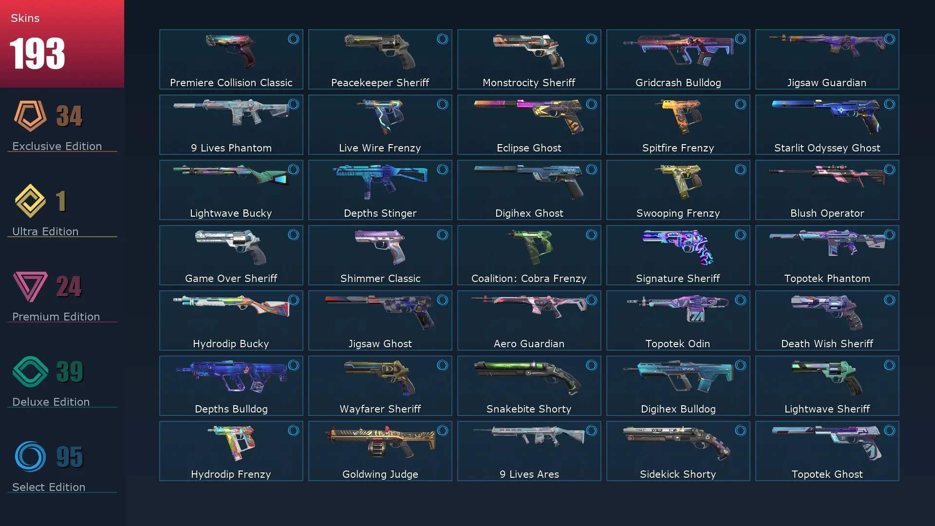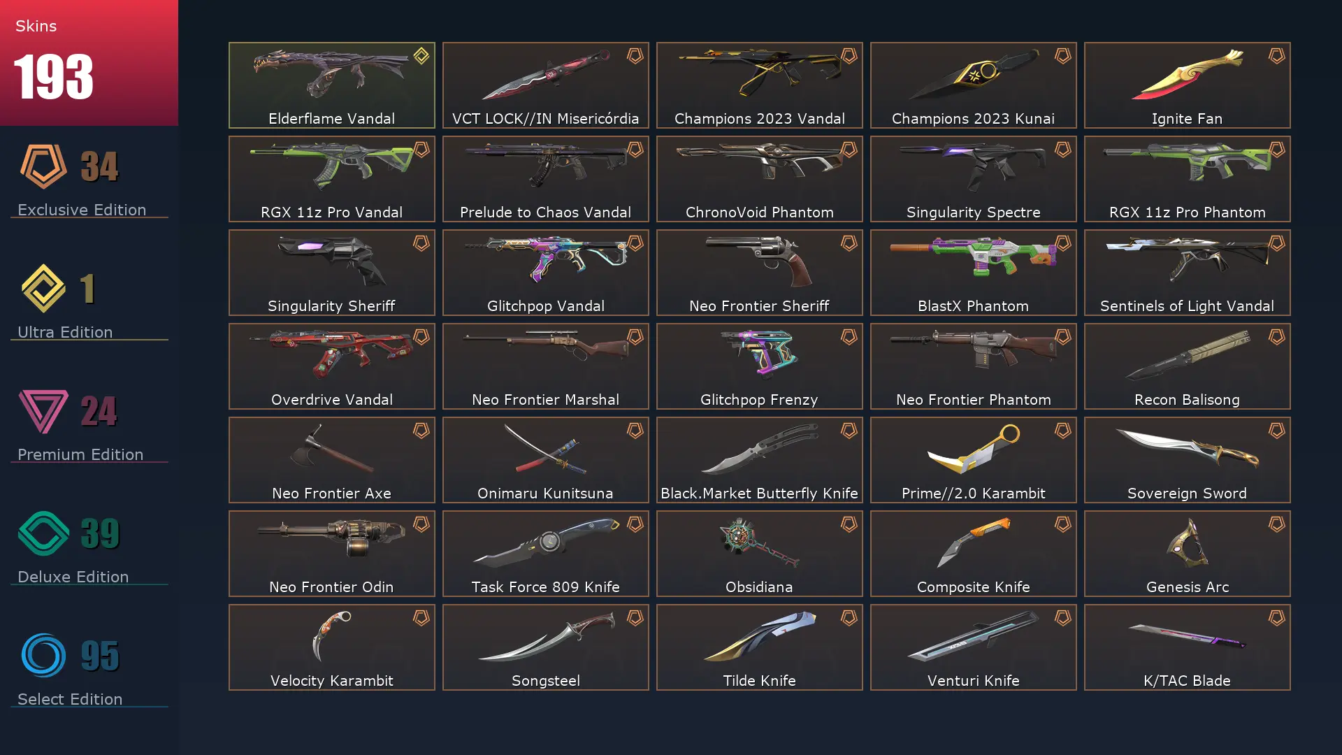 EU 🚠 193 Skins 🥍 27 Agents 😼 329 Level 📒 VCT LOCK//IN Misericórdia 🍤 Champions 2023 Vandal 🎐 Champions 2023 Kunai 🫧 Ignite Fan 🫀 RGX 11z Pro Vandal 🧄 Oni Vandal 🦁 Origin Vandal 📂 Prime//2.0 Phantom 🤳 Recon Balisong 🐆 Elderflame Vandal