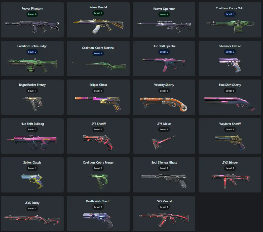 EU / 23 Skins / Reaver Phantom / Prime Vandal / .SYS Melee / Shimmer Classic / V82