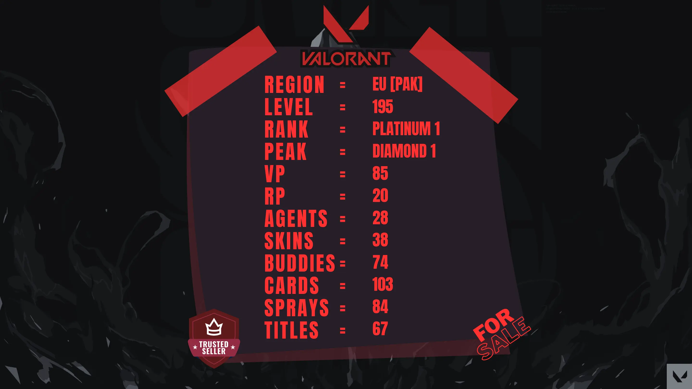 EU ⸱ 🎖️ Platinum 1 ⸱ 🔢 195 Level ⸱ ⬆️ Peak Diamond 1 ⸱ 🔫 38 Skins ⸱ 🎟️ 2x Battlepass ⸱ 💰 85 VP ⸱ 🔮 20 RP ⸱ 🧬 28x Agents ⸱ 📝 Check Description
