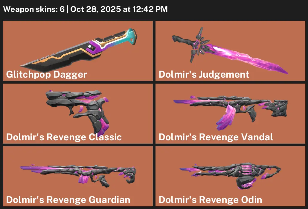 🖌 NA ☁️ Unranked 📙 6 Skins 🕰 250 VP 🛻 3 Agents ☀️ Value: 4350 VP 🌑 Glitchpop Dagger 🔮 Dolmir's Judgement 🎊 Dolmir's Revenge Classic ⛓️💥 Dolmir's Revenge Vandal 🌉 Dolmir's Revenge Guardian 📩 Dolmir's Revenge Odin
