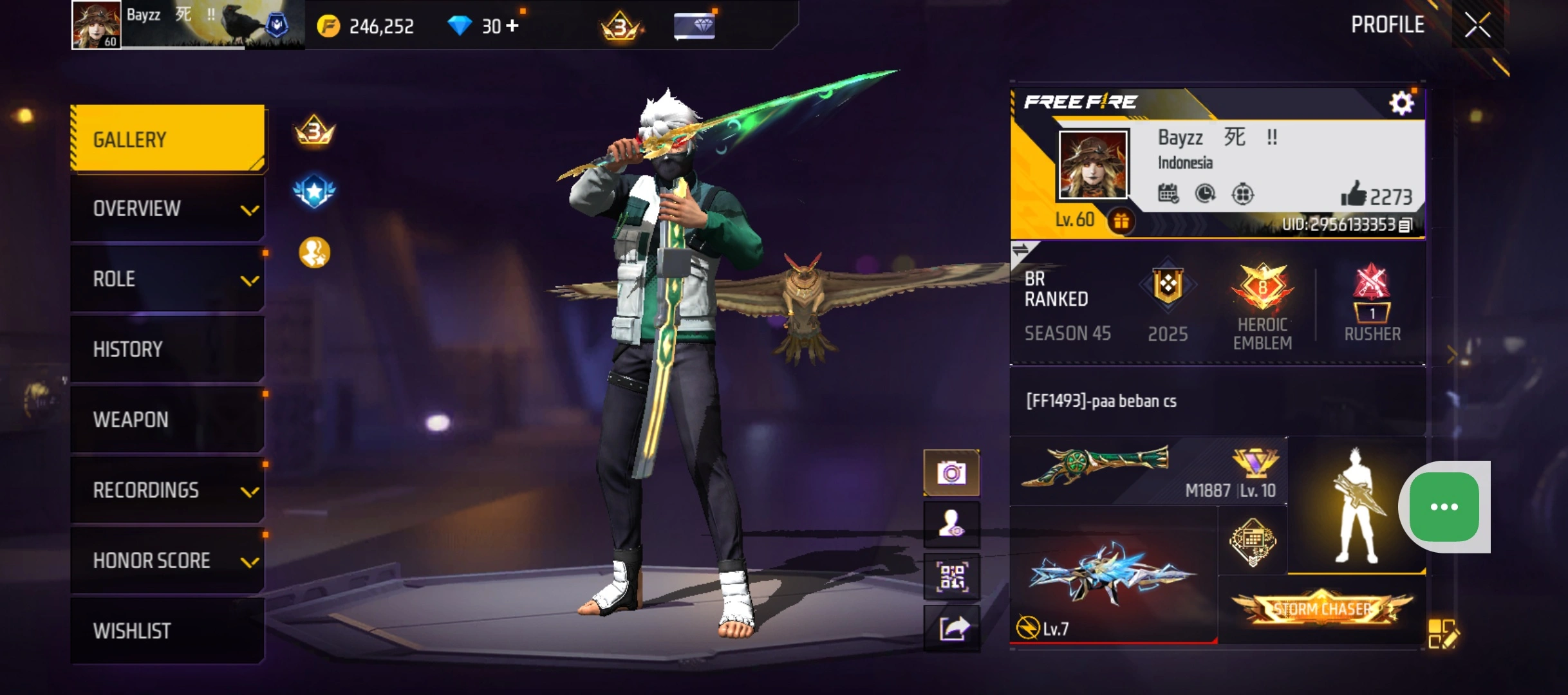 FF63|LV60/268 WEAPON (1 EVO + 45 Mythic)/XM8 ⸱ Destiny Guardian Lv. Max/244 COSTUME (15 Mythic)/27 EMOT (19 Mythic)/43 BACKPACK (1 Artifact + 17 Mythic)/4 SPORTS CAR (2 Mythic)