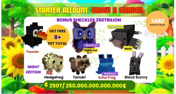 ⭐GAG Starter Account Edition | Night Owl, HedgeHog, Echo Frog ⸱ 8 Pets + 250T Shekcles Bonus | Grow A Garden