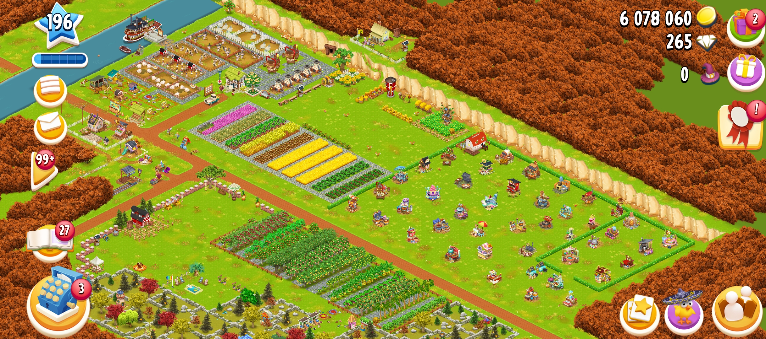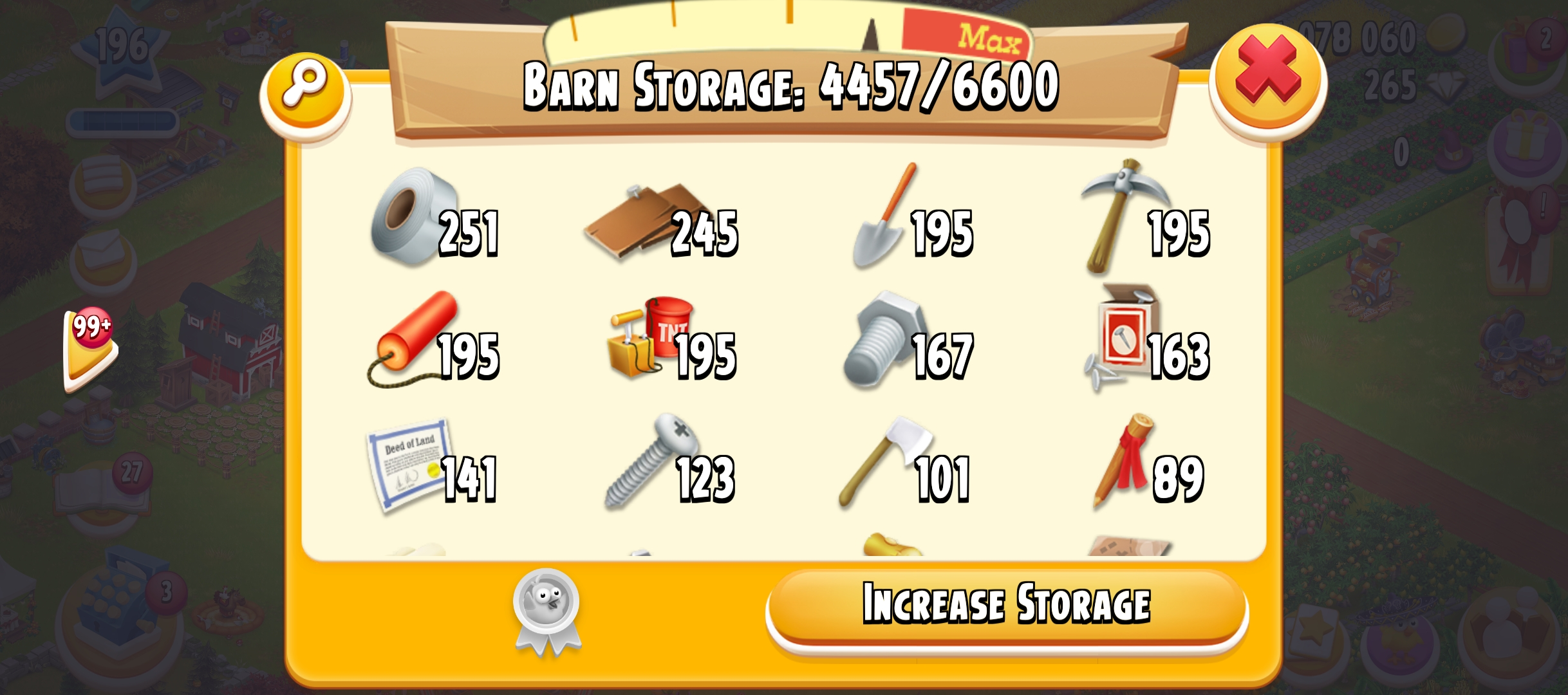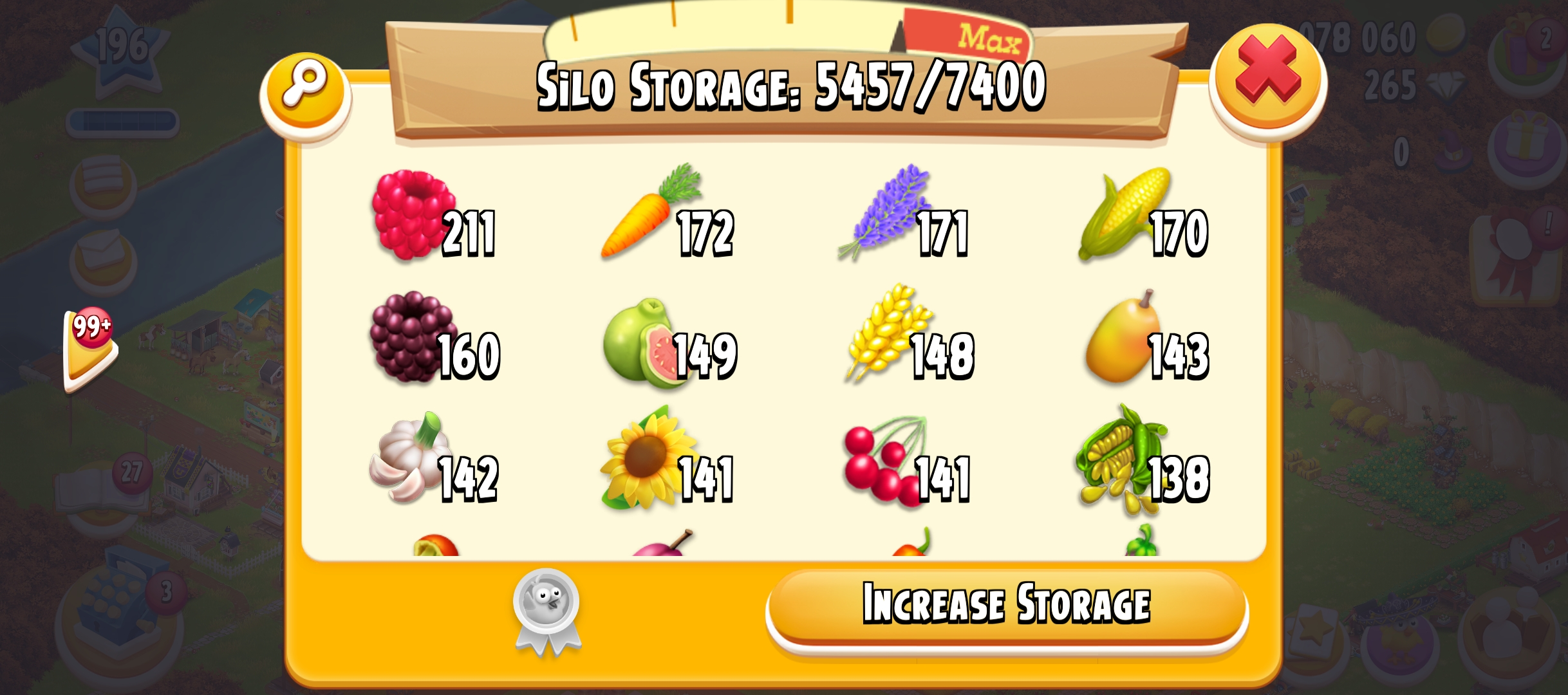 196 level | Barn Storage 6600 | Silo storage 7400 | 6M Coin | 265 gems | Android & IOS