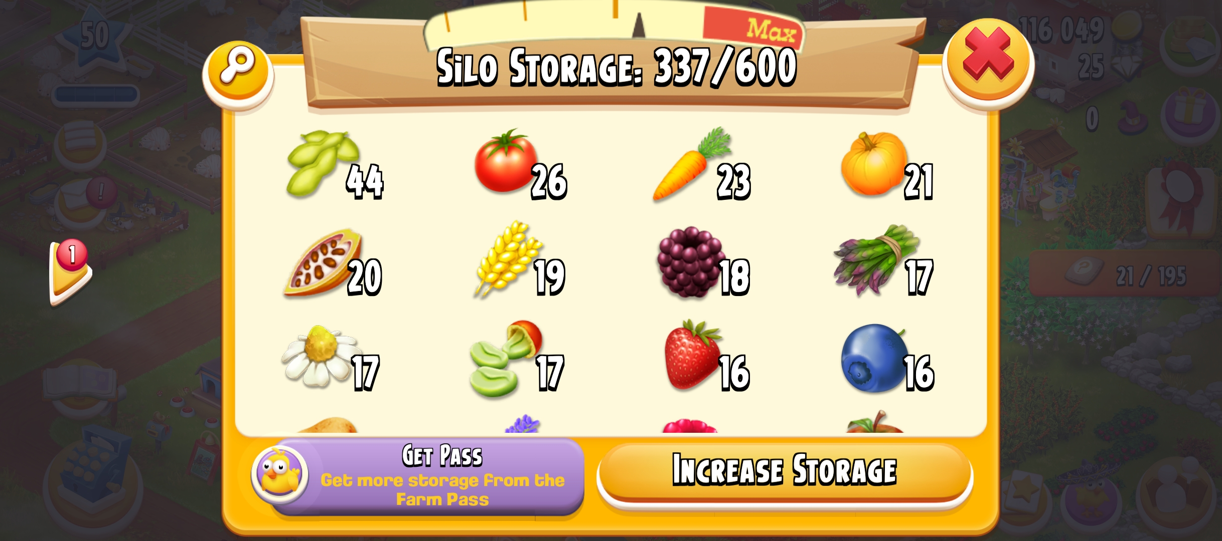 50 level | 650 Barn Storage | 600 silo storage | 100k Coin | 25 gems