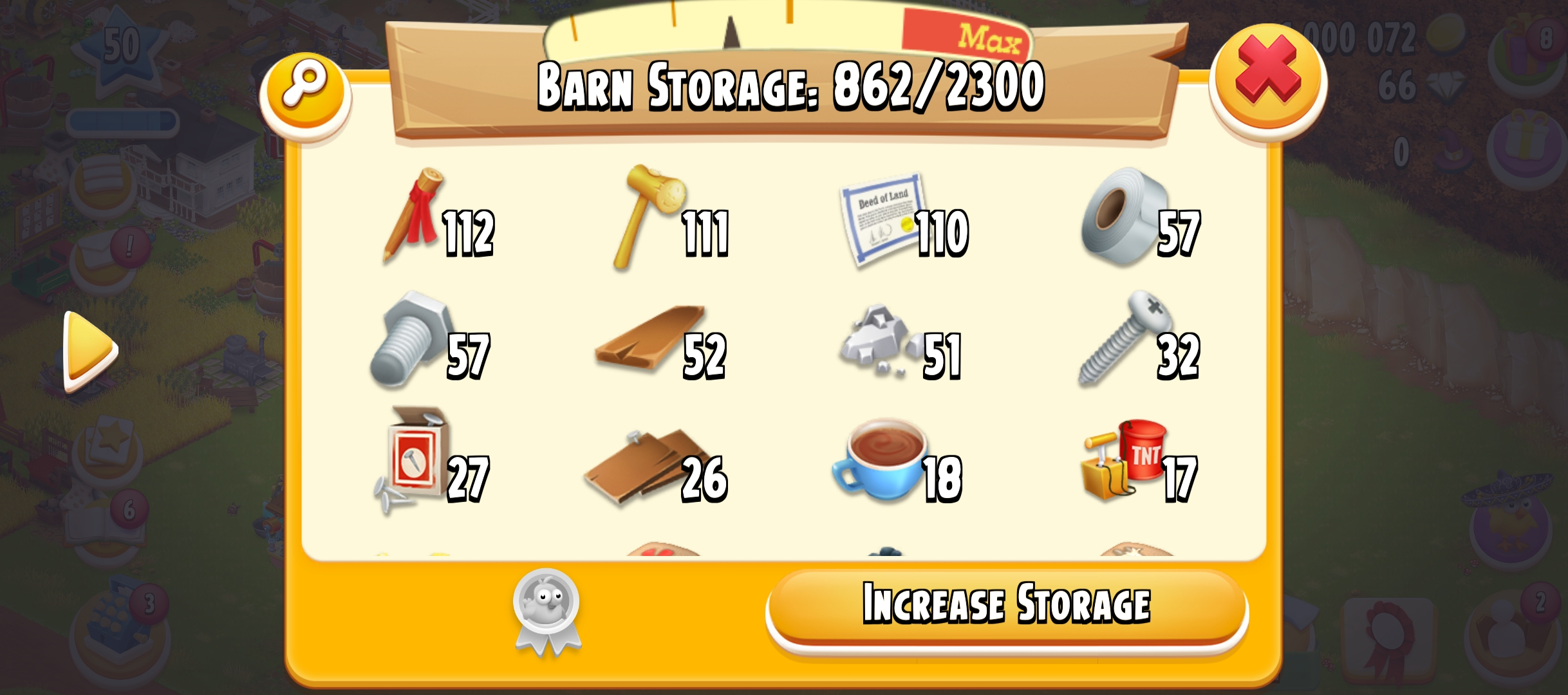 50 level | Barn Storage 2300 | Silo Storage 1000 | 1M Coin | 66 Gems | Android & IOS