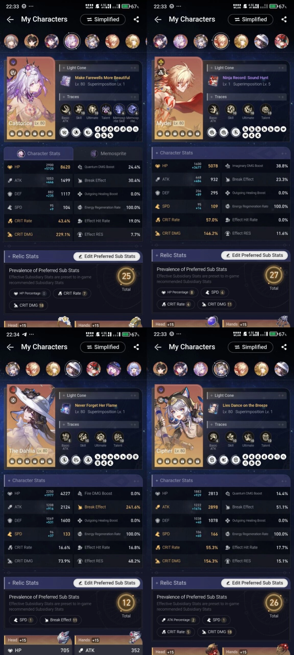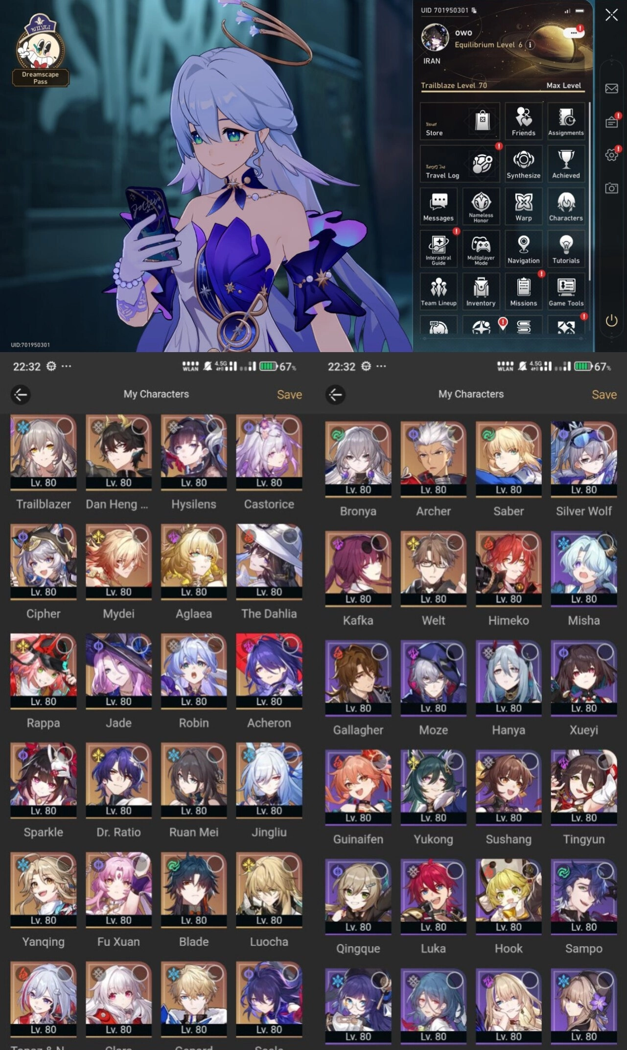 All Platform 🎮 EU 🇪🇺 Level 70 💯 50 Character 31 5'Star 🎖️ 31 Weapon 5'Star 👑 Castorice 🔥 Cipher 💲 The Dahlia 🎯 Acheron 🌐 Hysilens 👾 Code1224