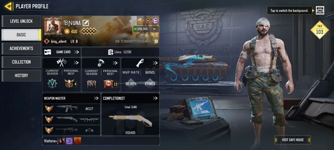 iOS Android 🛍️ Level 400 🌐 Rank Grand Master 😍 870 Epic ☠️ 11 Legendary 🎯 1 Mytich ✅ Code642