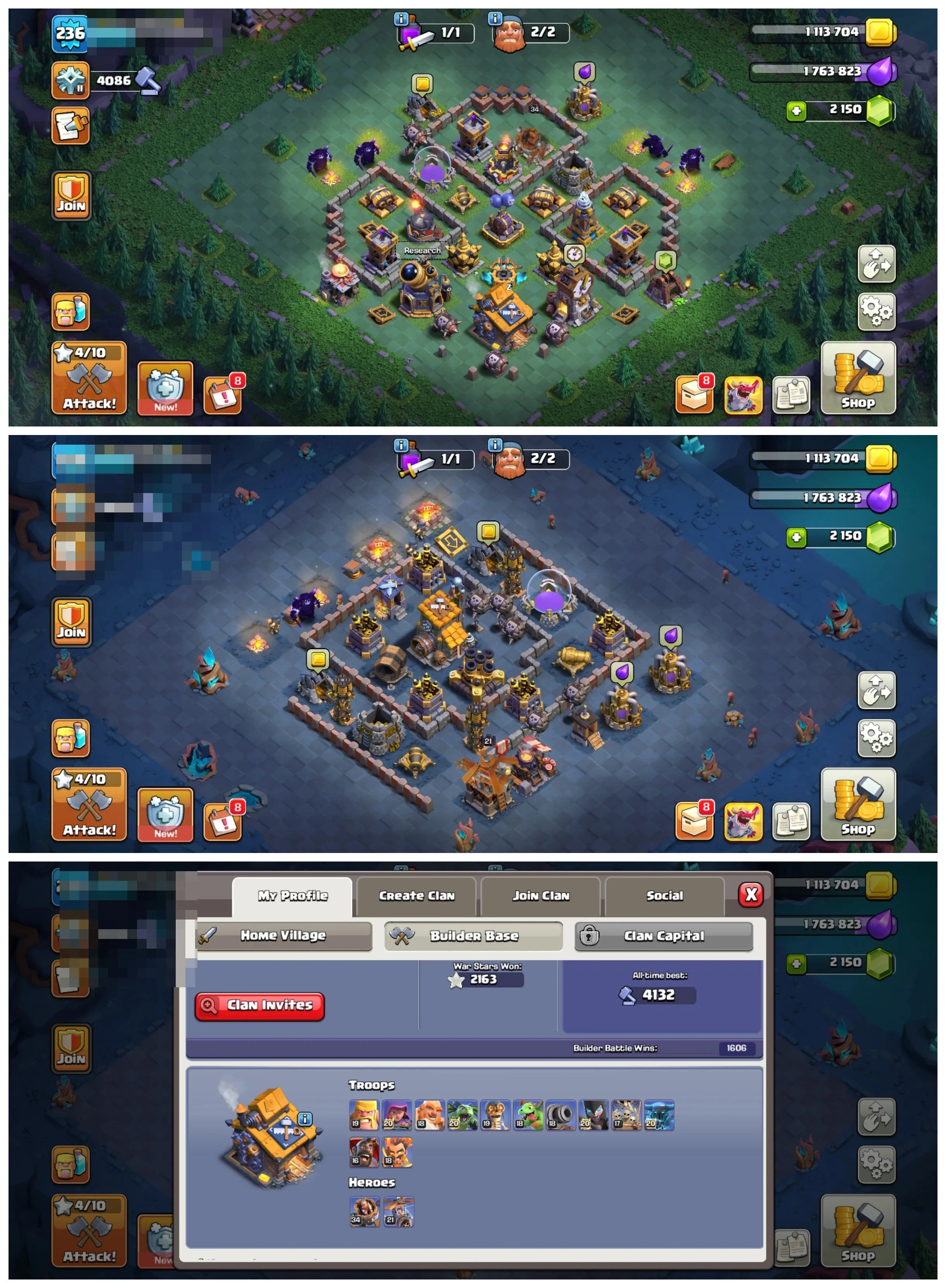 🏰 TH17 🛡️ Good Defence | 💎 2,150 Gems | 📈 Lvl 236 | 🦸♂️ Heroes 81/96/72/67/50 | 👕 3 Skins | ⚔️ 7 Epic Eq. | 💰 Nc 500 | 📱 Android/iOS | 🆔 M3769 !MKG016853