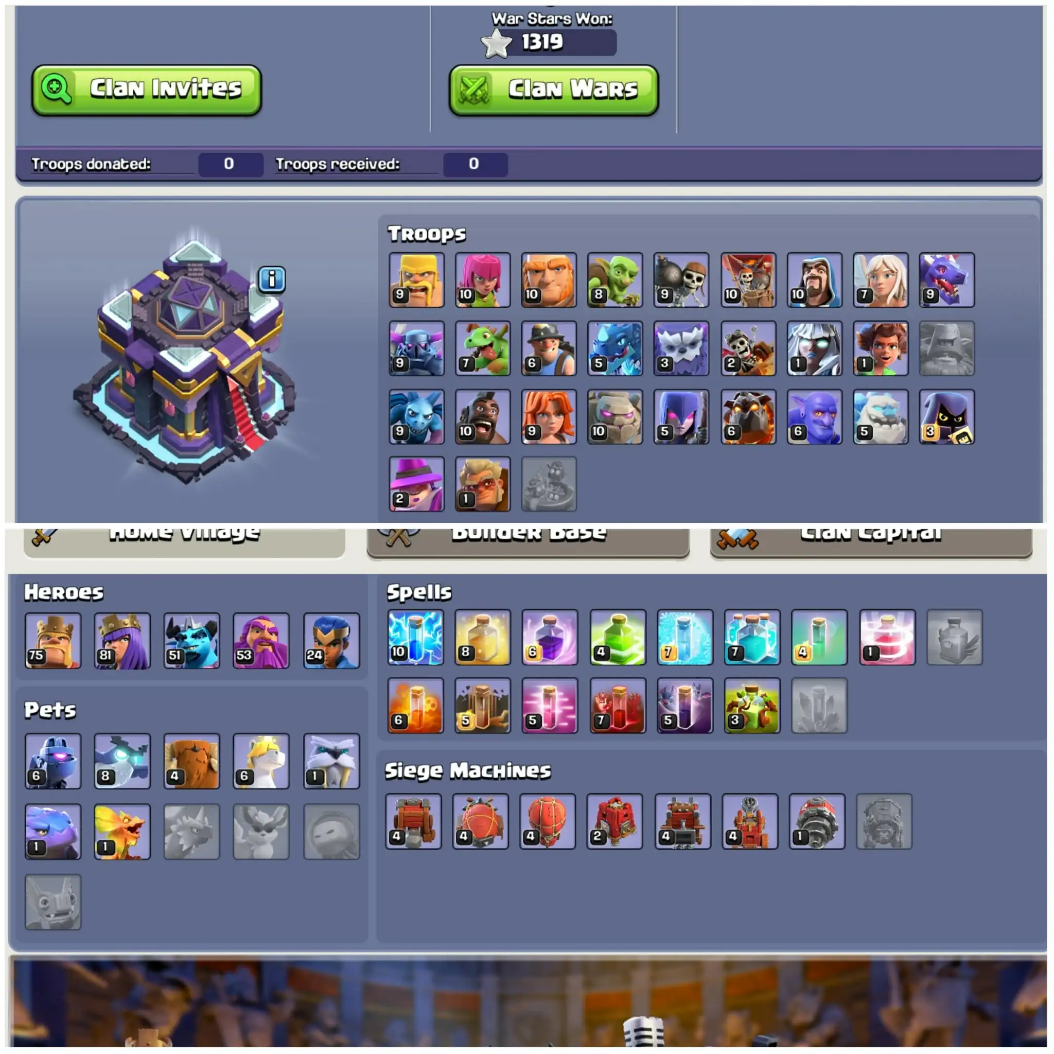 [High Heros]➤➤Th15 Special Account➤➤Heros:75-81-51-53-24➤➤6th Builders➤➤1600 Gems➤➤500 Nc➤➤432 Cwl Medals➤➤Exp:212