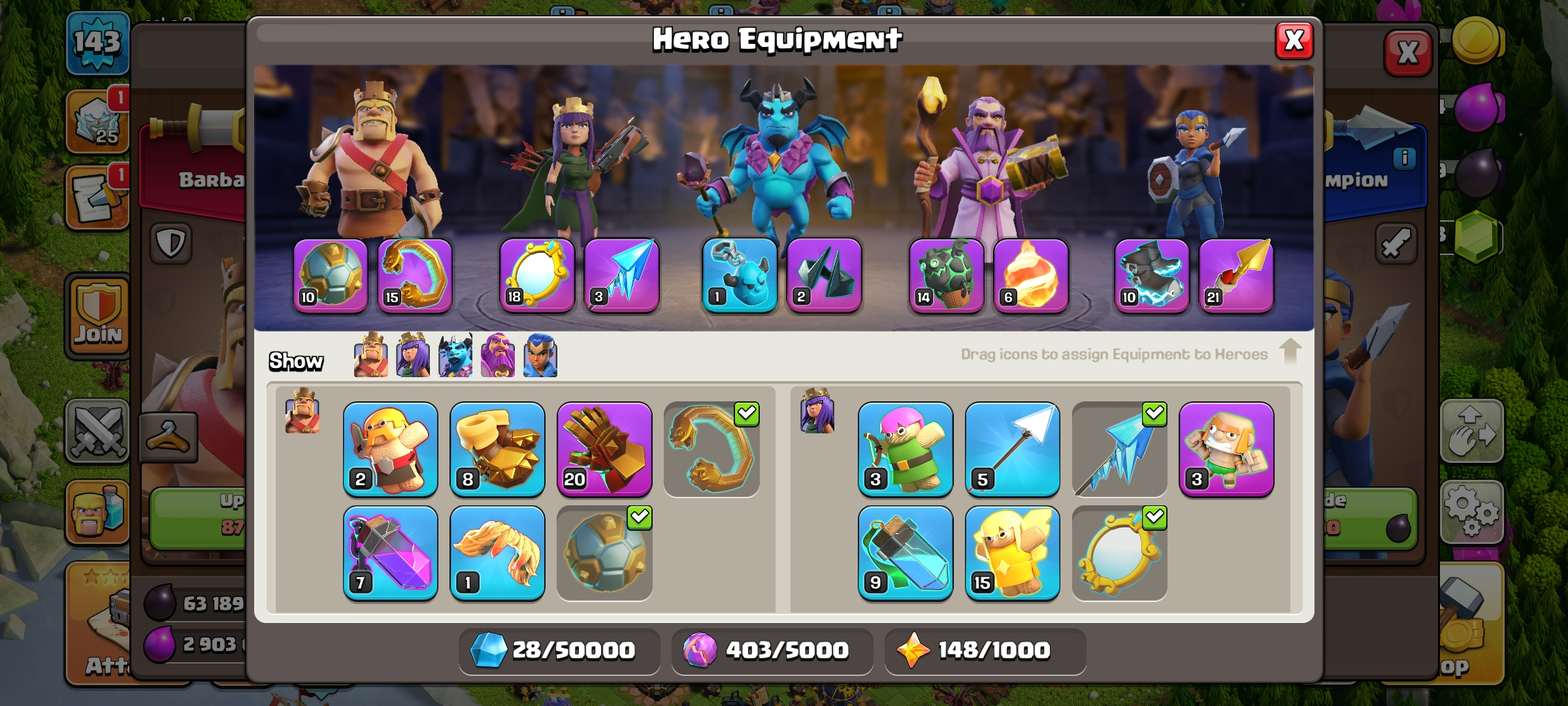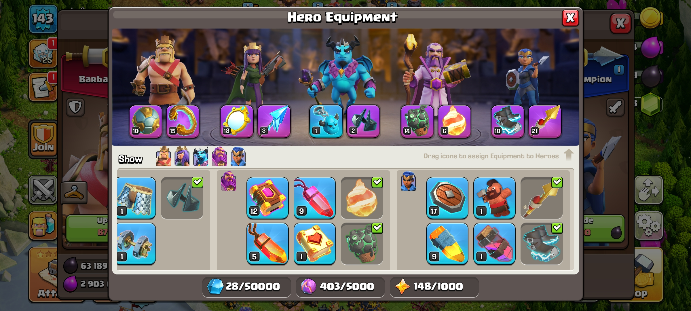 TH 17 RARE~HERO EQUIPMENT EPIC FULL~HERO BIG AND TALL- XP 143/BK 51/AQ 78 /PM 40 /GW 20-/RJ 25-/LOG SUPERCELL ID-/Andoid and ios|SCREENSHOTS ON DESCRIPTION