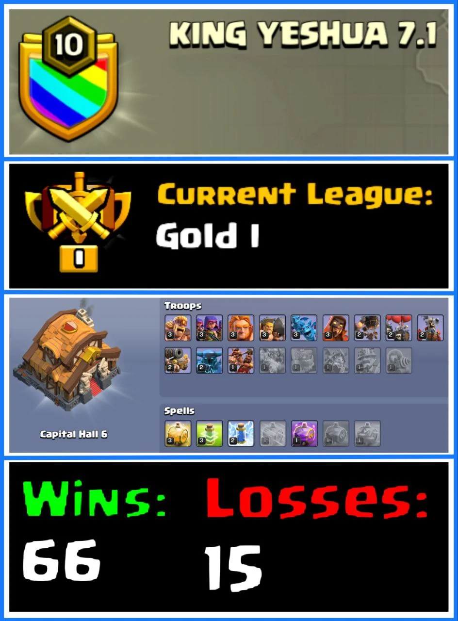 💥CRAZY PRICE💥 🔥OP LEVEL 10 ENGLISH CLAN 🌱 NICE NAME : KING YESHUA 7.1 💘 LEAUGE : GOLD 1 ♨️ CLAN CAPITAL : 6 🍄WINS : 66 | LOSS : 15 💥🗿 BEST CLAN BUY NOW 🧭 FAST DELIVERY