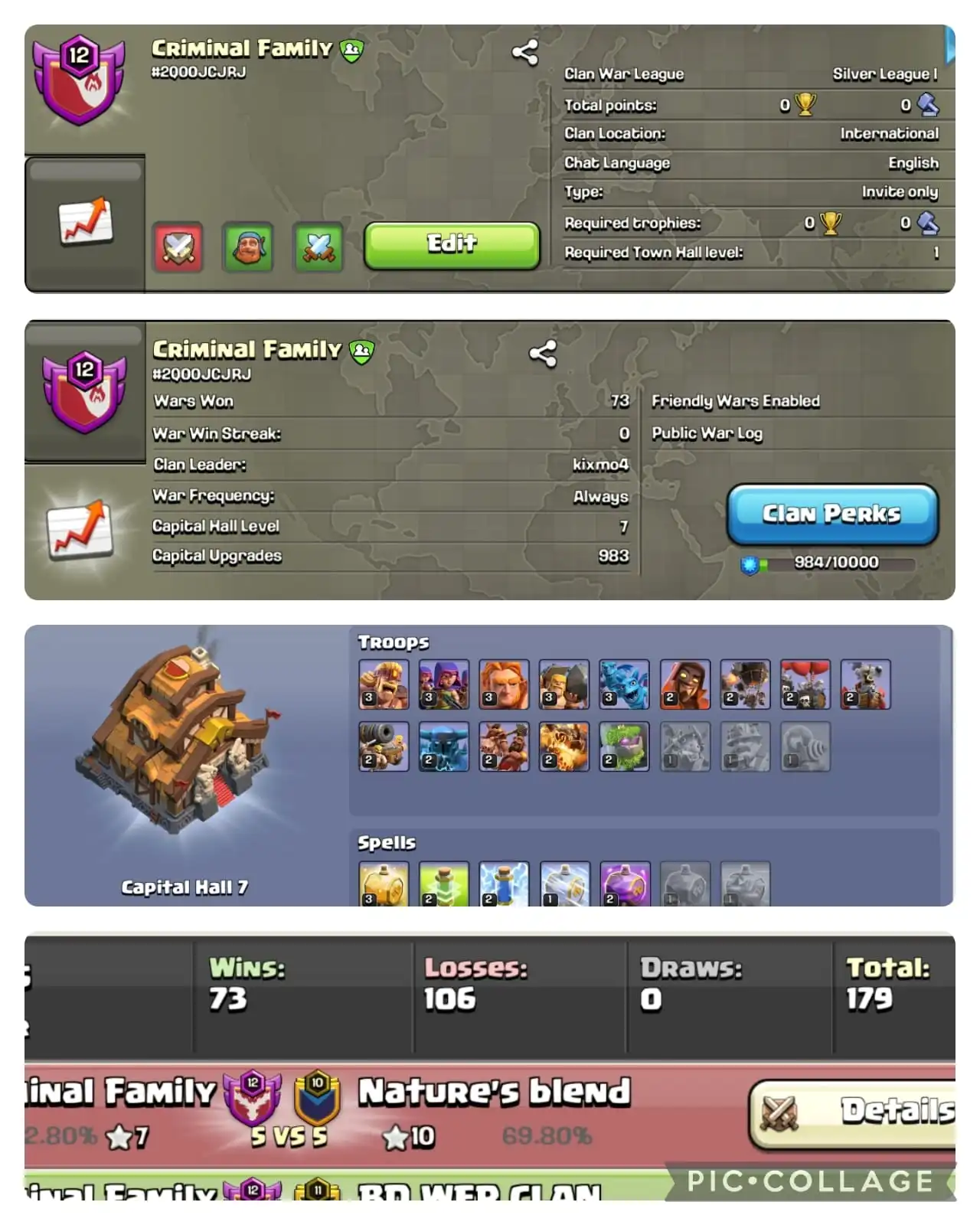 🔥NAME : CRIMINAL FAMILY 🥷 LEVEL : 12 🐢 WARLOG W-L-D : 73-106-179 🐺
