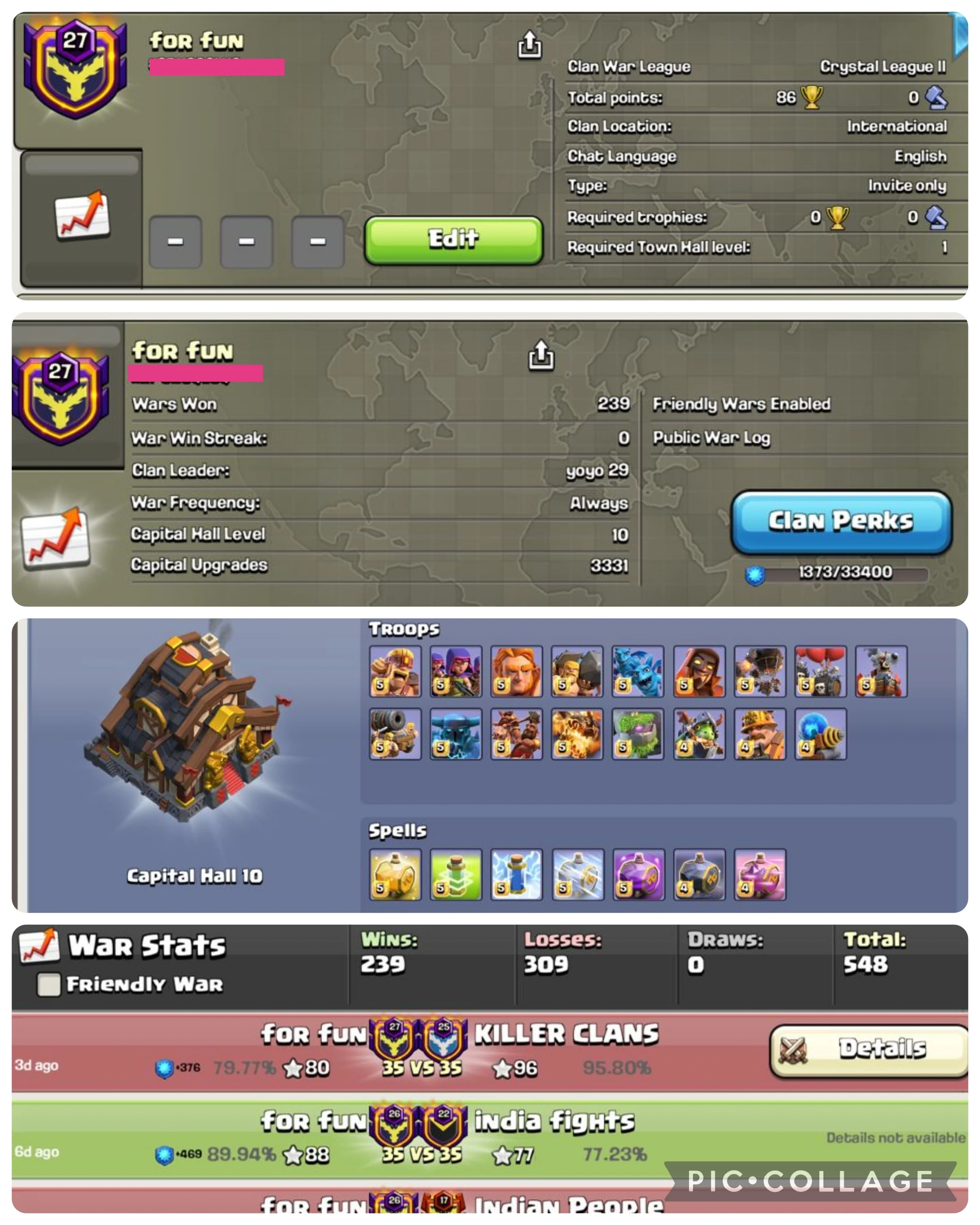 😊MASTER 3 + CC 10 😝FRIENDS FOREVER 💝 LEVEL : 17.5 💞WAR WINS 179 ,LOSSES 92 ,DRAW 1 🤓