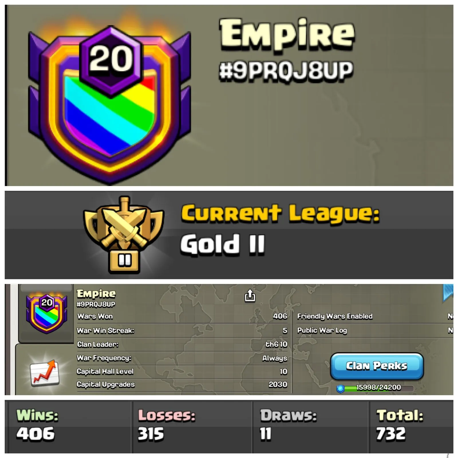 [CC: 10 ] Empire | LVL 20.7 | WARLOG W-L-D:406-315-11 | CWL League: GOLD 2 !!